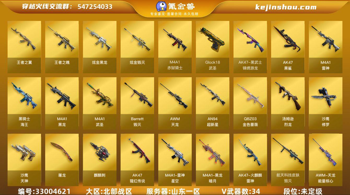 山东一区-36V-2王者-3炫金 【热门武器】:QBZ03-金色蔷薇,死亡之眼,汤姆逊-烈龙,加特林-炼狱*2,沙鹰-修罗*2 【王者炫金武器】:王者之翼,王者之魄,炫金黑龙*2,炫金毁灭 【音效卡】:M4A1-雷神音效卡,炼狱-百战金芒-庆典舞曲音效卡,死神-雪域霜狐-怀旧音效卡 【皮肤】:雷神-星空,M4A1-再燃火线,火麒麟-雷神,毁灭-暗月,毁灭-航天科技皮肤,黑龙-暗月,天龙-能量核心,炼狱-玩具枪皮肤,天神-暗月,轻型军用手斧-再燃火线 【角色】:战地猎狐,雪域霜狐,奇洋探员,乔伊教练,修道士,云海玲珑,暗夜-X,北极狐-X,初恋灵狐,芳心审判者,风暴女,嘉年华灵狐,娟娟,兰-海滩派对,麻雀,曼陀罗-X,潘多拉-甜心教官,潜龙队-X,新娜塔莎,影武者-X,智影 【人偶武器】:迷你救赎猎手,AWM-灵狐-15周年嘉年华,迷你裂空之翼*2,迷你波特博士*4,夺魂,迷你火种*2,迷你生化手雷,生化手雷-机甲核心*3,迷你艾比 【暴走生化】:死亡之眼,超级对讲机 【挑战大师】:冰龙粉碎者-白马银枪,激光毁灭者III,机甲撕裂者III,试炼破坏者III*2,KAC-圣炎切割者III,惩戒者III 【英雄级武器】:M4A1-黑龙,M4A1-雷神,AN94-超新星,M4A1-武圣,AK47-黑鲨,黑武士-锦绣游龙,Q...
