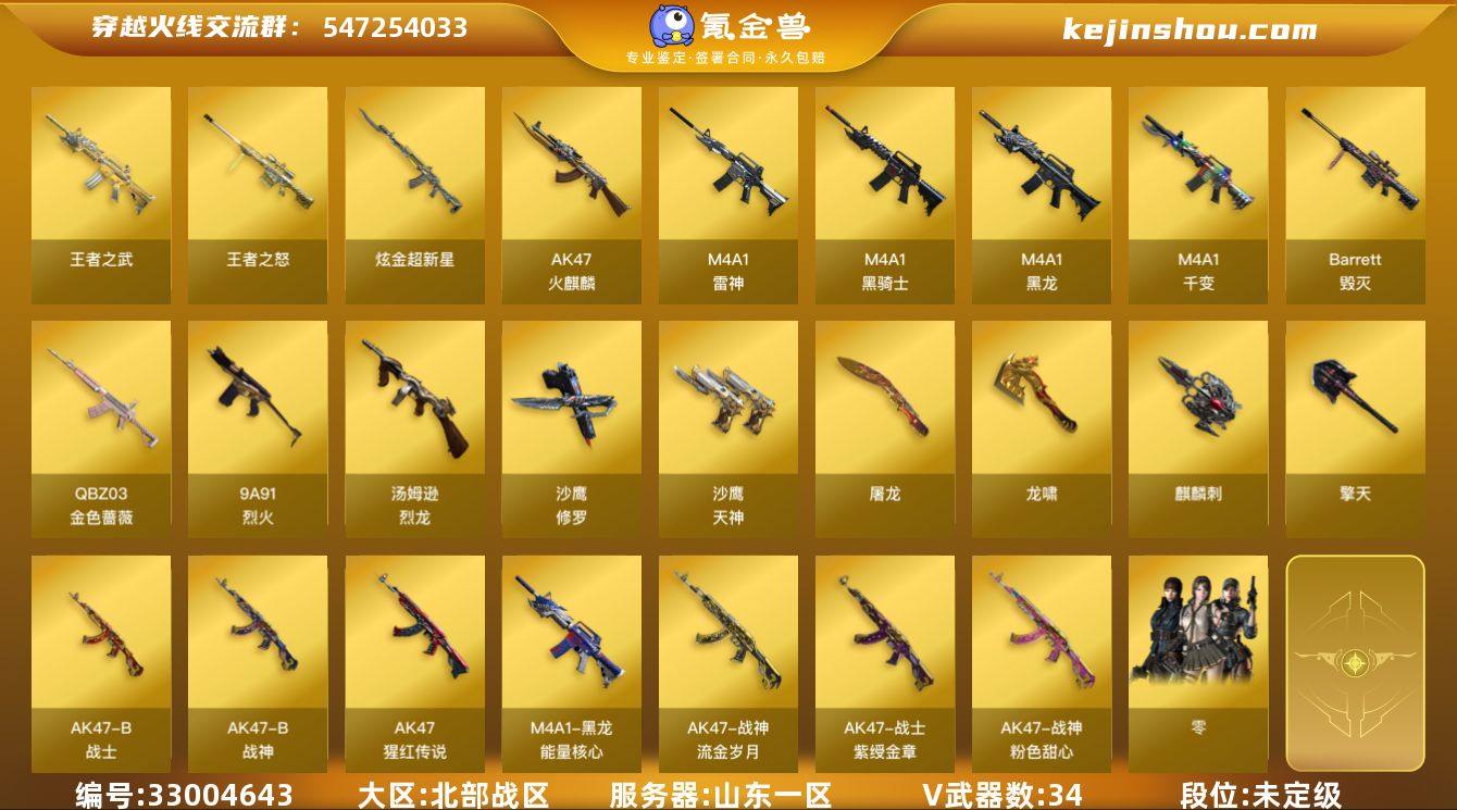 山东一区-35V-2王者武器数-1炫金武器数 【热门武器】:QBZ03-金色蔷薇*2,死亡之眼,M4A1-黑骑士*2,汤姆逊-烈龙*2,沙鹰-修罗*6 【王者炫金武器】:王者之武,王者之怒,炫金超新星 【皮肤】:黑龙-能量核心,战神-粉色甜心皮肤,战神-紫绶金章皮肤*2,战神-流金岁月皮肤*2 【角色】:零,暗夜-X,铁骑荣耀,影武者-X 【人偶武器】:闪光弹-小乔 【暴走生化】:死亡之眼 【英雄级武器】:M4A1-千变,AK47-火麒麟*2,M4A1-黑龙,M4A1-雷神,M4A1-黑骑士*2,QBZ03-金色蔷薇*2,9A91-烈火,AK-47-猩红传说*4,AK47-B-战神,AK47-B-战士,Barrett-毁灭,Barrett-金色蔷薇,汤姆逊-烈龙*2,沙鹰-修罗*6,沙鹰-天神,屠龙*3,龙啸,擎天,麒麟刺*2 【源级武器】:源·火麒麟*2,源·雷神*2,御·雷神-机甲刑天,源·天启,源·机械迷城,源·青龙,源·天龙,AWM-裁决-百城联赛天津 【道具】:炫彩背包,超级背包,灵魂忍者,变异宝贝,夺命之镰,防化服,金色流光-枪王排位,防弹头盔*2,防弹衣*2,C4工具钳,手雷包 【特殊枪械】:2黑骑士,2烈龙