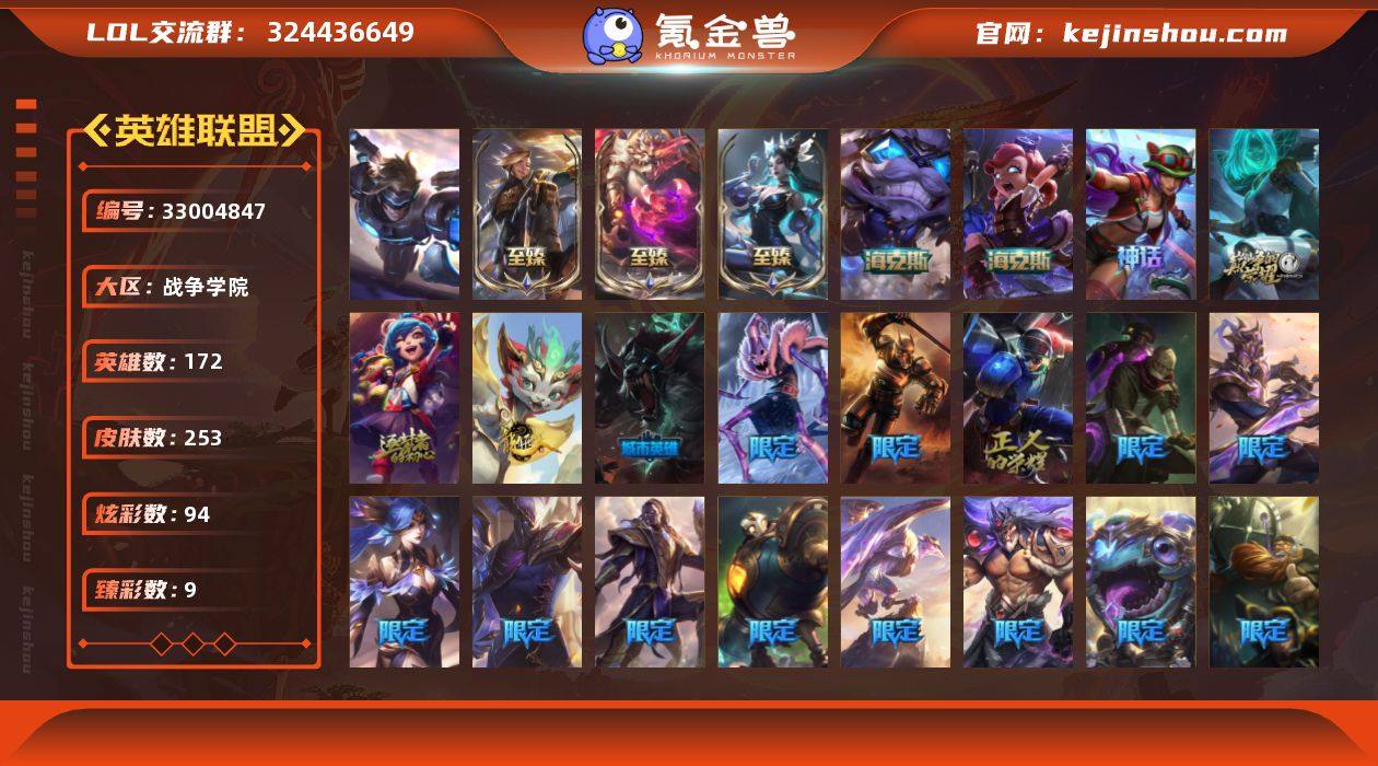【LOLYH2045】172英雄/253皮肤/1终极/9神话/35限定/9臻彩/94炫彩/34传说/54史诗/未定级/雪花/10周年 安妮/源代码 乐芙兰/十五周年纪念 希维尔/10周年庆典 凤凰/至臻 灵能特工 伊泽瑞尔/至臻 神龙尊者均衡之龙 沃利贝尔/至臻 星之守护者 辛德拉/海克斯 安妮/海克斯 吉格斯/无畏骑士 瑟庄妮 赤子初心/西部天使 赛娜 神选天使长/黎明使者 锐雯 黑夜使者/玉剑传说 无劫 胭脂/咖啡甜心 璐璐 焦糖布丁/灰烬守护者 慎 余烬觉醒/魔女 阿卡丽 虚荣/净雪之月 莫甘娜 冬虹/天龙之子 斯莫德/觅心女王 寒冰/圣诞开心鬼 提莫/平安夜女神 娑娜/邪恶圣诞老人 维迦/雪默丁格/魄罗骑士 瑟庄妮/冰雪节 格雷福斯/冰雪兽 纳尔/未来战士/S1FNC 酒桶/S1FNC 嘉文四世/S1FNC 卡尔萨斯/S3 SKT T1 婕拉/S4 SSW 图奇/S5 SKT T1 雷克顿/S6 SKT T1 扎克/S9 FPX 普朗克/S9 FPX 墨菲特/暗裔英雄 盖伦/胜利之剑 亚托克斯/胜利枪神 卢锡安/胜利机器人 布里茨/胜利凤凰 艾尼维亚/胜利之王 泰达米尔/胜利巨口 克格莫/胜利女神 娑娜/胜利剑圣 易/南瓜头 费德提克/魅惑女巫 奈德丽/糖果使徒 费德提克/泳池派对 瑟提/暗影 沃里克/防暴天使 凯尔/警用试作体K-9 内瑟斯/双城之战2 微光实验室 辛吉德/地狱之门卫士 加里奥...
