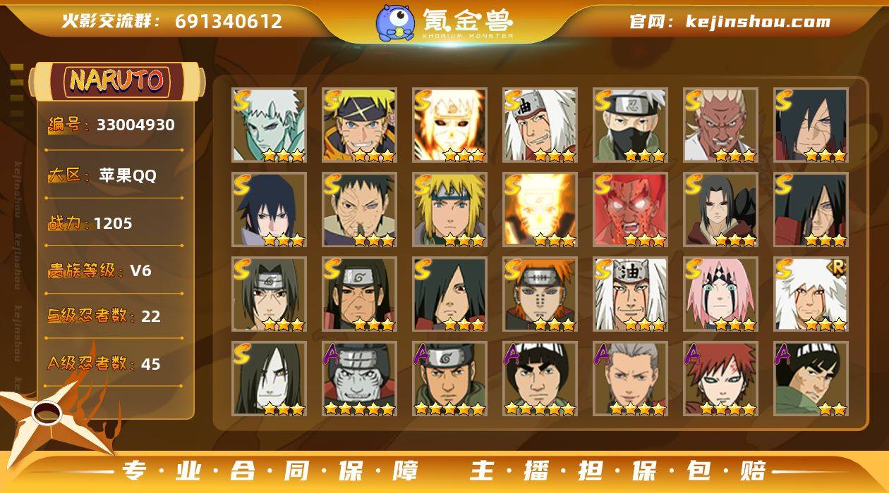 【HYYH1378】V6/战力1205W/S忍22/A忍45/三星S-宇智波斑「秽土转生」/二星A-大野木「侠隐江湖」/三星S-波风水门「九喇嘛连结」/三星S-宇智波带土「十尾人柱力」/二星A-达鲁伊「五代目雷影」/二星A-飞段「死司凭血」/二星A-宇智波止水/五星A-猿飞阿斯玛/三星S-旗木卡卡西「须佐能乎」/2星小南「神驹佑将」/三星S-宇智波斑/二星A-猿飞阿斯玛「秽土转生」/五星A-迈特凯/三星S-自来也/二星A-奇拉比「忍界大战」/2星旗木卡卡西「神威对决」/二星A-长十郎「六代目水影」/二星A-蝎「绯流琥」/二星A-桃地再不斩「秽土转生」/三星S-迈特凯「死门」/三星S-自来也 「传说中的三忍」/二星A-黑土「四代目土影」/二星A-迪达拉「秽土转生」/二星A-药师兜「半蛇斗篷」/三星S-春野樱 「忍界大战」/二星A-我爱罗「忍界大战」/二星A-迪达拉/四星A-我爱罗「疾风传」/二星A-不动/二星A-猿飞木叶丸「博人传」/二星A-大蛇丸「晓」/二星A-日向宁次·忍界大战/二星A-宇智波鼬/三星S-宇智波佐助「永恒万花筒」/三星S-宇智波鼬「秽土转生」/二星A-长门「青年」/二星A-桃地再不斩/二星A-宇智波佐助「疾风传咒印」/三星S-宇智波带土 「忍界大战」/二星A-蝎/三星S-佩恩「天道」/三星S-漩涡鸣人·宇智波佐助/三星...