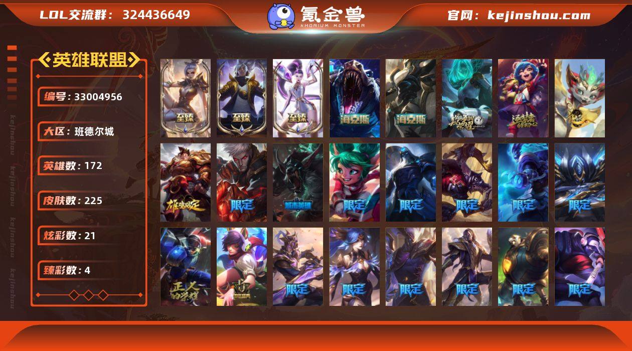 【LOLYH2033】172英雄/225皮肤/8神话/25限定/4臻彩/21炫彩/28传说/67史诗/未定级/10周年 安妮/源代码 乐芙兰/10周年庆典 凤凰/至臻 玉剑传说 武剑仙/至臻 K/DA ALL OUT卡莎/至臻 真实伤害 亚索/海克斯 雷克顿/海克斯 人马/无畏骑士 瑟庄妮 赤子初心/冠军之箭 艾希 凯旋圣装/魔女 阿卡丽 虚荣/净雪之月 莫甘娜 冬虹/张辽 文远/天龙之子 斯莫德/幸福女神 乐芙兰/圣诞精灵 崔丝塔娜/冰雪节 格雷福斯/冠军典狱长 锤石/冠军掠夺者 卡兹克/冠军之志 瑞兹/S2 暗杀星 慎/S6 SKT T1 奥拉夫/S8 IG 乐芙兰/5周年 阿狸/胜利之剑 亚托克斯/胜利枪神 卢锡安/胜利机器人 布里茨/胜利女神 娑娜/胜利剑圣 易/南瓜头王子 阿木木/鬼影森森 茂凯/无头骑士 赫卡里姆/暗影 沃里克/波比的巧克力工坊/都铎王朝 图奇/征服者 韦鲁斯/防暴天使 凯尔/铁哥们儿 奥拉夫/魔幻卡牌 崔斯特/源计划:林 易/约德尔国队长 提莫/女皇 艾希/鬼魂新娘 莫甘娜/双重冰晶 艾尼维亚/黯晶凤凰 艾尼维亚/律政大亨 蒙多/冰霜之刃 艾瑞莉娅/最终BOSS 维迦/地狱行者 孙悟空/神拳 李青/炼狱魔犬 内瑟斯/战斗学院 伊泽瑞尔/腥红之月 鬼武姬 阿卡丽/冰霜亚龙 希瓦娜/焰尾妖狐 阿狸/符文战熊 沃利贝尔/宇航员 诺提勒斯/女校长 菲奥...