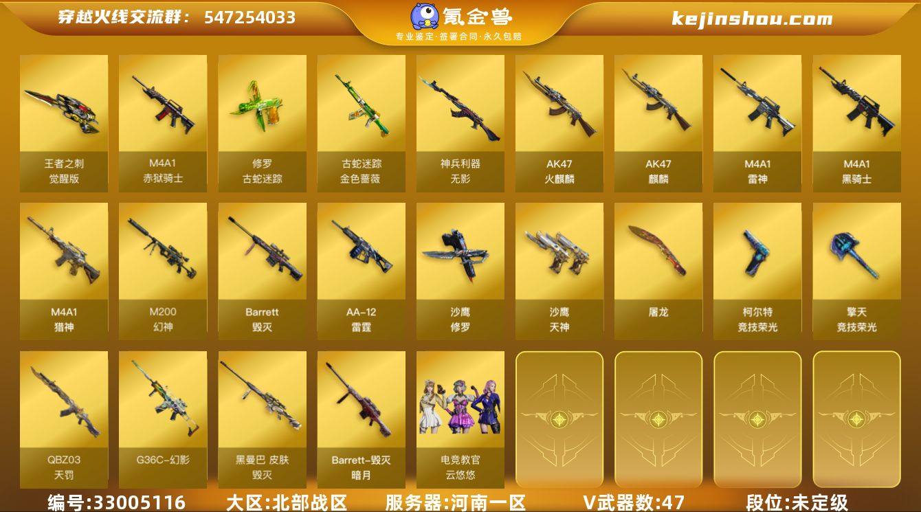 河南一区-50V-1王者武器数-0炫金武器数 【热门武器】:G36C-幻影,M200-幻神,金色蔷薇-古蛇迷踪,修罗-古蛇迷踪,死亡之眼,M4A1-黑骑士,沙鹰-修罗 【音效卡】:麒麟刺-百战金芒-盛典舞曲音效卡,炼狱-百战金芒-庆典舞曲音效卡 【皮肤】:幻神-荣耀世冠EP 皮肤,M4A1-再燃火线,毁灭-暗月,毁灭-黑曼巴 皮肤,毁灭-英雄计划 皮肤,轻型军用手斧-再燃火线 【角色】:电竞教官-云悠悠,零·纪元,战地猎狐,蛇隐宗,葵-阿尔法武装,幻面灵狐,暗夜-X,初恋灵狐,芳心审判者,龙儿,蛇姬,斯沃特-X,兔囡囡,团团 【人偶武器】:生化手雷-机甲核心*3 【暴走生化】:死亡之眼,超级对讲机 【挑战大师】:激光毁灭者III-白马银枪 【英雄级武器】:AK47-火麒麟,AK47-麒麟,M4A1-雷神,M4A1-黑骑士,QBZ03-天罚,无影-神兵利器,G36C-幻影,金色蔷薇-古蛇迷踪,M4A1-猎神,HK417-朱雀-电竞之星,机械迷城-穹宇,Barrett-毁灭,M200-幻神,炼狱-百战金芒,AA-12-雷霆,沙鹰-修罗,沙鹰-天神*3,柯尔特-竞技荣光,修罗-古蛇迷踪,屠龙*3,擎天-竞技荣光,麒麟刺-百战金芒,王者之刺-觉醒版,屠龙-电竞之星,高爆手雷-竞技荣光*5,高爆手雷-古蛇迷踪,闪光弹-竞技荣光*4,烟雾弹-竞技...