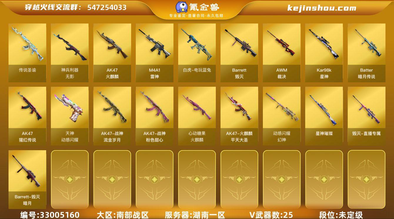 湖南一区-29V-1王者武器数-0炫金武器数 【传说武器】:传说圣谕 【热门武器】:传说圣谕,白虎-电玩蓝兔,Kar98K-星神 【王者炫金武器】:王者冰锋 【音效卡】:AWM-裁决音效卡,炼狱-百战金芒-庆典舞曲音效卡,火线妹语音包 【皮肤】:幻神-动感闪耀 皮肤,幻神-电竞之星 皮肤,裁决-星际旅行 皮肤,星神-璀璨皮肤,M4A1-再燃火线,雷神-神秘按键 皮肤,火麒麟-平天大圣,火麒麟-心动糖果,毁灭-暗月,毁灭-直播专属,毁灭-英雄计划 皮肤,战神-粉色甜心皮肤,战神-流金岁月皮肤,轻型军用手斧-再燃火线 【角色】:奇洋探员,乔伊教练,云海玲珑,葵-阿尔法武装,幻面灵狐,暗夜-X,北极狐-X,初恋灵狐,嘉年华灵狐,娟娟,0号玩家,灵狐者-X,麻雀,曼陀罗-X,女主播,青霞仙子,蛇姬,斯沃特-X,蜀雪,兔囡囡,夜玫瑰-幻能朋克,团团 【人偶武器】:M4A1-雷神-精英刀锋,AWM-灵狐-15周年嘉年华,迷你裂空之翼,迷你牛牛,深渊终结者手雷,迷你超能女侍 【挑战大师】:AK47-冰龙粉碎者 【英雄级武器】:AK47-火麒麟,M4A1-雷神,无影-神兵利器,SCAR Light-玄豹,AK-47-猩红传说*2,白虎-电玩蓝兔,HK417-朱雀-电竞之星,机械迷城-穹宇,Barrett-毁灭,AWM-裁决,Kar98K-星...