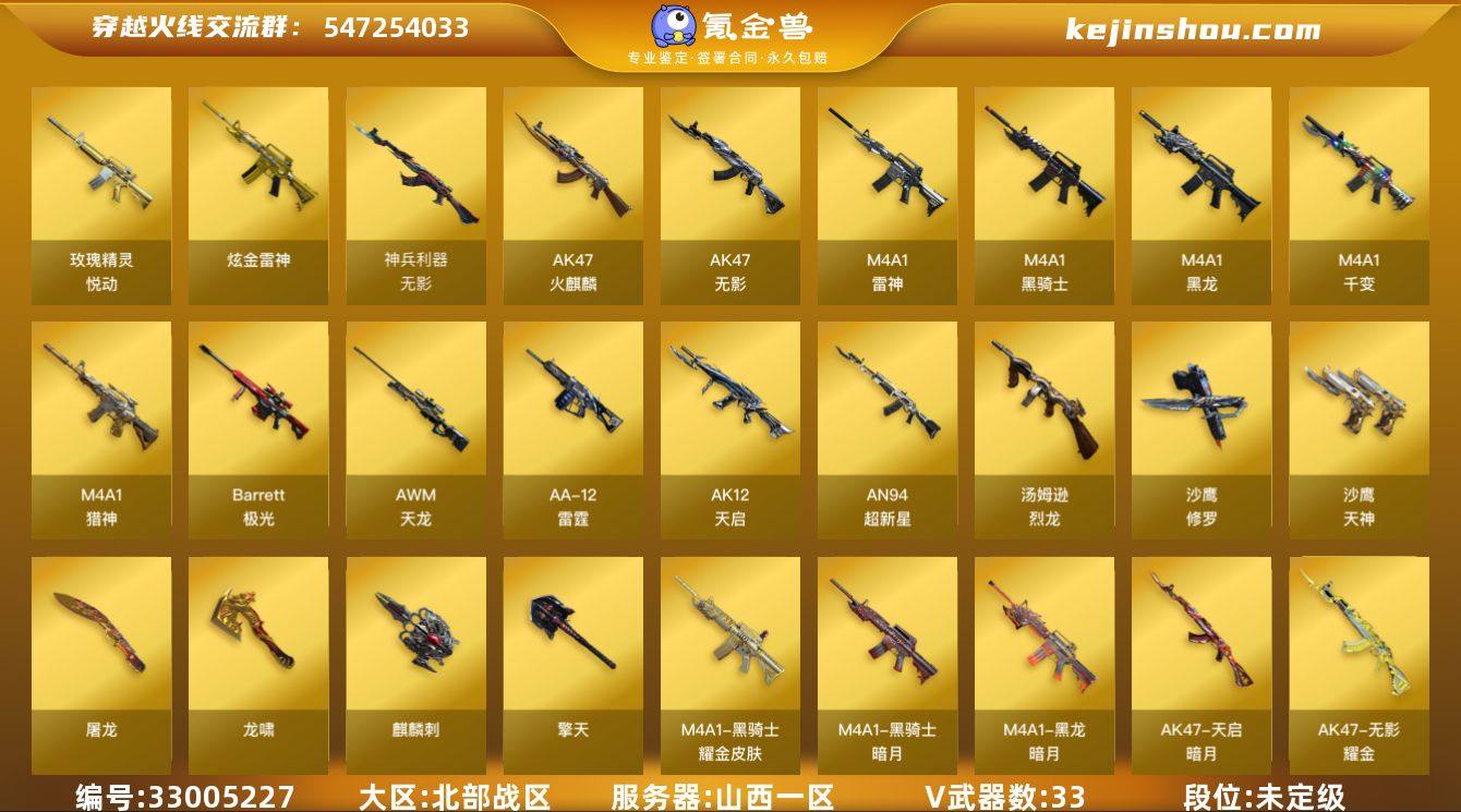 山西一区-34V-6王者-1炫金 【热门武器】:M4A1-黑骑士*2,汤姆逊-烈龙,加特林-炼狱,沙鹰-修罗*3 【王者炫金武器】:玫瑰精灵-悦动,王者青龙,王者玉锋*2,炫金雷神 【音效卡】:M4A1-黑骑士音效卡 【皮肤】:雷神-源计划2.0专属 皮肤,毁灭耀金皮肤,黑龙-暗月,黑骑士-暗月,黑骑士耀金皮肤,无影耀金皮肤,天启-暗月,HK417-朱雀-掌火灵橙 皮肤,极光-掌火灵耀 皮肤,修罗-能量核心 【角色】:樱,芳心审判者,飞虎队-X,风暴女,嘉年华灵狐,娟娟,曼陀罗-X,潘多拉-甜心教官,潜龙队-X,蛇姬,雪莉杨,夜玫瑰-幻能朋克 【人偶武器】:AWM-灵狐-15周年嘉年华,迷你牛牛,深渊终结者手雷 【挑战大师】:神圣爆裂者-末日III 【英雄级武器】:M4A1-千变,AK47-火麒麟,M4A1-黑龙,M4A1-雷神,M4A1-黑骑士*2,AK47-无影,AK12-天启,AN94-超新星,无影-神兵利器,M4A1-猎神,王者火魄-觉醒版,AWM-天龙*2,Barrett-极光,王者之怒-觉醒版,加特林-炼狱,汤姆逊-烈龙,AA-12-雷霆,沙鹰-修罗*3,沙鹰-天神,屠龙*2,龙啸,擎天,麒麟刺 【道具】:冰冰企鹅背包,炫彩背包,绿色巨人,灵魂忍者,迷雾幽灵,生化弹匣,夺命之镰*2,防化服*3,金色流光-枪王排位*2,星辰流光-枪...