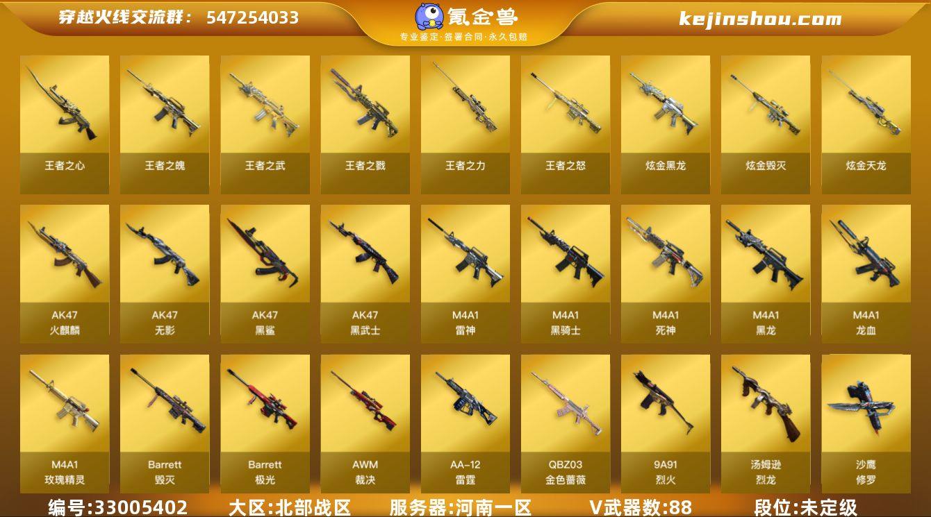 河南一区-92V-17王者武器数-5炫金武器数 【热门武器】:QBZ03-金色蔷薇,金色小号,C.A.T,M4A1-黑骑士,汤姆逊-烈龙*2,加特林-炼狱*5,沙鹰-修罗*2 【王者炫金武器】:王者之戮*2,王者之武,王者之魄*3,王者之心,王者之怒*6,王者之力,炫金骑士,炫金黑龙,炫金毁灭*2,炫金天龙 【音效卡】:AK47-火麒麟音效卡,M4A1-雷神音效卡,M4A1-黑骑士音效卡,Barrett-毁灭音效卡 【皮肤】:烈龙-星空,雷神-暗月,雷神-能量核心*2,雷神-星空,毁灭-暗月,毁灭耀金皮肤,黑龙-能量核心,M4A1-黑龙-361,无影-能量核心,无影耀金皮肤*4,无影-霓裳皮肤,天启-暗月,战神-粉色甜心皮肤*11,战神-紫绶金章皮肤*34,战神-流金岁月皮肤*20,AWM-天龙-传奇白鲨,极光-能量核心,修罗耀金皮肤,天神-暗月 【角色】:葵,王者-零,王者之瞳,空,风暴女,嘉年华灵狐,零-水下丽影,王者-零-传说之路,影武者-X 【人偶武器】:AWM-灵狐-15周年嘉年华,C.A.T,闪光弹-小乔 【英雄级武器】:AK47-火麒麟,M4A1-黑龙*3,M4A1-雷神,M4A1-黑骑士,AK47-无影*2,M4A1-死神,AK47-黑武士*3,AK47-黑鲨*5,M4A1-龙血,M4A1-玫瑰精灵*2,QBZ03-金色蔷薇,9A91-烈火*5,AK-47-猩红传说*32,AK47-B...