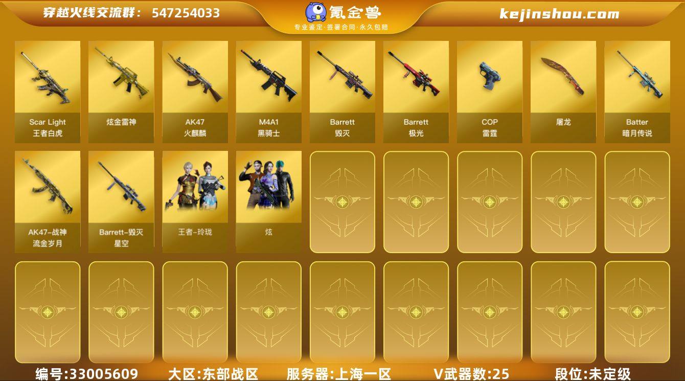 上海一区-26V-1王者武器数-1炫金武器数 【热门武器】:王者白虎,M4A1-黑骑士 【王者炫金武器】:王者白虎,炫金雷神 【皮肤】:毁灭-星空,战神-流金岁月皮肤 【角色】:炫,王者玲珑 【人偶武器】:M37-葵 【英雄级武器】:AK47-火麒麟,M4A1-黑骑士,Barrett-毁灭*2,Barrett-极光,Barrett-暗月传说,COP-雷霆*2,屠龙,尼泊尔-雷霆,高爆手雷-雷霆*5,闪光弹-雷霆*5,烟雾弹-雷霆*5 【源级武器】:源·火麒麟,源·雷神,M4A1-十二生肖·龙-雷神,源·武圣,源·天龙,魂·毁灭-神秘黑洞,魂·天神-宇航兔兔 【道具】:夺命之镰,防化服,金色流光-枪王排位,防弹头盔,防弹衣,C4工具钳,手雷包 【特殊枪械】:1黑骑士