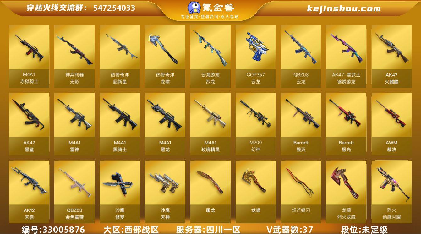 四川一区-39V-2王者武器数-0炫金武器数 【热门武器】:QBZ03-金色蔷薇,M200-幻神,死亡之眼,M4A1-黑骑士,COP-白鲨,沙鹰-修罗,炽芒蝶刃 【音效卡】:屠龙-动感闪耀 音效卡,烈火-动感闪耀 音效卡,Barrett-极光音效卡 【皮肤】:AWM-裁决-凤灵皮肤,雷神-暗月,雷神-机甲刑天皮肤,雷神-云海游龙皮肤,火麒麟-平天大圣,火麒麟-心动糖果,毁灭-暗月,毁灭-黑曼巴 皮肤,黑骑士-战神马超,天启-暗月,天龙-能量核心,极光-能量核心,屠龙-星火燎原 【角色】:葵,隼,战地猎狐,奇洋探员,乔伊教练,修道士,云海玲珑,电竞少女,风暴女,虎妞,嘉年华灵狐,潘多拉-X,青霞仙子,斯沃特-X,兔囡囡,雪莉杨-摸金校尉,夜玫瑰-幻能朋克,影武者-X,游珑儿,团团 【人偶武器】:COP-白鲨,AWM-灵狐-15周年嘉年华,迷你生化手雷,生化手雷-机甲核心 【暴走生化】:死亡之眼 【挑战大师】:神圣爆裂者-末日III 【英雄级武器】:AK47-火麒麟,M4A1-黑龙,M4A1-雷神,M4A1-黑骑士,AK12-天启,AK47-黑鲨,无影-神兵利器,QBZ03-云龙,黑武士-锦绣游龙,超新星-热带奇洋,M4A1-玫瑰精灵,QBZ03-金色蔷薇,烈火-动感闪耀,王者之势-觉醒版,超新星-悦享-觉醒版,机械迷城-穹宇,Barr...