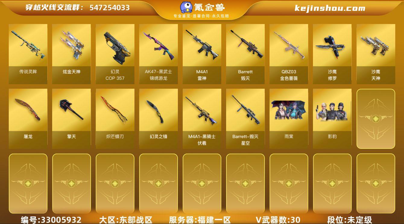 福建一区-32V-0王者武器数-2炫金武器数 【传说武器】:传说灵眸 【热门武器】:传说灵眸,QBZ03-金色蔷薇,COP 357-幻灵,沙鹰-修罗*3,炽芒蝶刃,炽芒蝶刃-破浪逐光 皮肤 【王者炫金武器】:炫金天神*2 【皮肤】:金色蔷薇-破浪逐光 皮肤,雷神-炽焰魔龙,雷神-化蛇 皮肤,毁灭-星空,黑骑士-伏羲,屠龙-春桃 皮肤,屠龙-破浪逐光 皮肤,炽芒蝶刃-破浪逐光 皮肤 【角色】:雨棠,影豹,暗夜-X,芳心审判者,猎狐者-追月,0号玩家,流浪蔷薇,龙儿,麻雀,蛇姬,甜心偶像 【人偶武器】:夺魂,生化手雷-机甲核心 【暴走生化】:超级对讲机 【挑战大师】:神圣爆裂者-末日III 【英雄级武器】:M4A1-雷神,黑武士-锦绣游龙,QBZ03-金色蔷薇,Barrett-毁灭,沙鹰-修罗*3,沙鹰-天神,COP 357-幻灵,屠龙,擎天,尼泊尔-雷霆,幻灵之锋,炽芒蝶刃,高爆手雷-雷霆,高爆手雷-幻灵*3,高爆手雷-竞技荣光,闪光弹-雷霆,闪光弹-幻灵*3,闪光弹-竞技荣光,烟雾弹-雷霆,烟雾弹-幻灵*3,烟雾弹-竞技荣光 【源级武器】:源-黑龙,源·雷神,魂·M4A1-雷神-化蛇,魂-死神-机甲核心,御·超新星-圣诞,魂·HK417-朱雀-凤灵,灵·HK417-朱雀-甜蜜火力,白虎-九尾白狐,魂·QBZ03-金色蔷薇-蛇姬,Q...