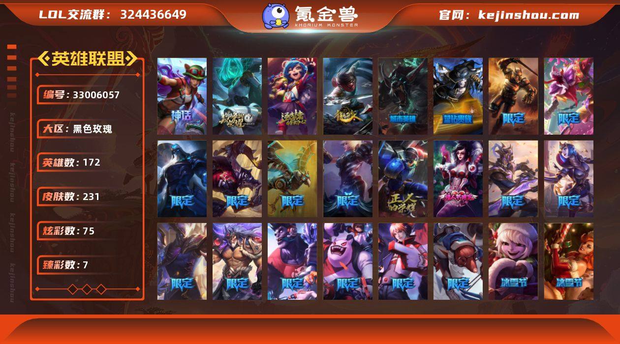 【LOLYH2039】172英雄/231皮肤/3神话/32限定/7臻彩/75炫彩/22传说/53史诗/未定级/10周年 安妮/源代码 乐芙兰/十五周年纪念 希维尔/赵云 子龙 炫金将军/战斗学院 卡特琳娜 盛典礼服/灵魂莲华 锐雯 流火/海之歌 艾希 冰爽浪花/魔女 阿卡丽 虚荣/净雪之月 莫甘娜 冬虹/这货不是银狐-库奇/银龙裁决 泰隆/碧玉之牙 卡西奥佩娅/觅心猎手 薇恩/幸福女神 乐芙兰/圣诞精灵 崔丝塔娜/圣诞狂欢 努努/圣诞糖果棒 厄运小姐/圣诞狂欢 时光/邪恶圣诞老人 维迦/夺命美人 卡特/雪默丁格/冰雪节 炼金/冠军之刃 锐雯 2016/冠军之志 瑞兹/S2 暗杀星 蒙多/S2 暗杀星 努努/S2 暗杀星 伊泽瑞尔/S4 SSW 图奇/暗裔英雄 盖伦/胜利女神 奥莉安娜/胜利之剑 亚托克斯/胜利之王 泰达米尔/胜利剑圣 易/南瓜头 费德提克/无头骑士 赫卡里姆/蓝色忧郁 崔斯特/暗影 沃里克/都铎王朝 图奇/钢铁之翼 艾尼维亚/防暴天使 凯尔/惊悚派对 费德提克/警用试作体K-9 内瑟斯/铁哥们儿 奥拉夫/恶魔男爵 瑞兹/提莫:"约德尔人的一大步"/合金巨兽 努努和威朗普/幻灵战斗队长 厄运小姐/女皇 艾希/电玩女神 娑娜/红色男爵 库奇/陆地王者4WD 布里茨/苹果机器人 布里茨/冰川巨兽 墨菲特/神拳 李青/炼狱魔犬 内瑟斯/腥红之月 鬼武姬...