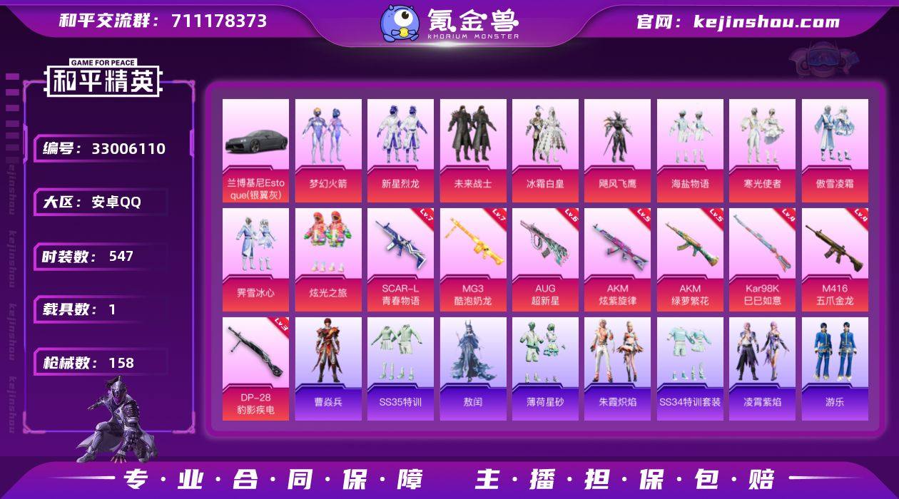 精氪素材号/60级收藏家【火箭少女/未来战士/新星烈龙】6级aug超新星/4级五爪金龙/螳螂/暗影哥特/浪漫天命/罗小黑/金羽特工/满级青春物语/5级ak旋紫旋律/兰博基尼 实名: 可修改 时装数: 547 载具数: 1 枪械数: 158 战备数: 109 热门装扮: 梦幻火箭(新101),未来战士,冰霜白皇,新星烈龙,飓风飞鹰,海盐物语,寒光使者,傲雪凌霜,霁雪冰心,激萌罗小黑,炫光之旅 载具: 兰博基尼Estoque(银翼灰) 稀有枪皮: AKM炫紫旋律,M416五爪金龙,SCAR-L青春物语,AUG超新星,MG3酷泡奶龙,AKM绿萝繁花,Kar98K-巳巳如意,DP-28-豹影疾电