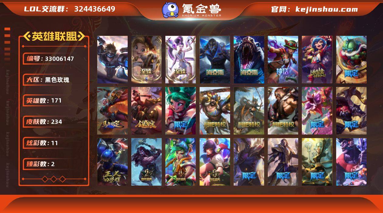 【LOLYH1998】171英雄/234皮肤/1终极/6神话/29限定/2臻彩/11炫彩/25传说/68史诗/未定级/10周年 安妮/十五周年纪念 希维尔/至臻 奥术师 佐伊/至臻 K/DA ALL OUT卡莎/海克斯 卡萨丁/海克斯 雷克顿/无畏骑士 瑟庄妮 赤子初心/替父从军 花木兰 炫金龙刃/替父从军 花木兰/金猪烈焰 瑟庄妮/“主人不要我了” 阿木木/胡桃夹子 小丑/平安夜女神 娑娜/夺命美人 卡特/冰雪节 茂凯/冰雪节 炼金/冰雪兽 纳尔/未来战士/S1FNC 迦娜/S2 暗杀星 蒙多/S4 SSW 炼金/S4 SSW 图奇/S5 SKT T1 蜘蛛/2周年 德莱厄斯/4周年 锐雯/5周年 阿狸/胜利之剑 亚托克斯/胜利枪神 卢锡安/无头骑士 赫卡里姆/泳池派对 菲奥娜/外星装甲 库奇/野兽猎人 德莱文/野兽猎人 瑟庄妮/野兽猎人 泰达米尔/波比的巧克力工坊/都铎王朝 图奇/防暴天使 凯尔/惊悚派对 费德提克/地狱之门卫士 加里奥/魔幻卡牌 崔斯特/邪鸦魅影 乐芙兰/大天使长米迦勒 凯尔/恶魔男爵 瑞兹/烈焰雄心 崔丝塔娜/女皇 艾希/源计划:联合 艾希/双重冰晶 艾尼维亚/红色男爵 库奇/最终BOSS 维迦/未来战士 凯特琳/陆地王者4WD 布里茨/苹果机器人 布里茨/神拳 李青/第三类接触 黑默丁格/死亡骑士 盖伦/钢铁军团 盖伦/黎明使者 锐雯/冰霜亚龙 希瓦娜/霸天异形...