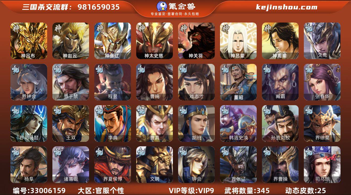 【4819】官阶:大将军;VIP等级:VIP9;史诗武将数量:37;动态皮肤数量:25;武将总数:345;史诗宝珠数量:0;将魂数量:6143;神将:4;魏国史诗武将:16;蜀国史诗武将:7;吴国史诗武将:8;群史诗武将:14 神吕布,神赵云,神张辽,神太史慈,界钟会,界于禁,曹纯,戏志才,程昱,谋赵云,谋马超,赵襄,王平,沙摩柯,花鬘,董允,周处,孙皓,留赞,界朱然,界徐盛,界步练师,文鸯,左慈,郑玄,张让,星甘宁,苏飞,麹义,南华老仙,刘焉,沮授,界左慈,界李儒,谋张角,星董卓,兀突骨,神吕蒙,神周瑜,神关羽,SP关羽,SP曹仁,SP蔡文姬,乐进,曹昂,诸葛诞,朱灵,文聘,SP姜维,张春华,钟会,曹冲,郭淮,满宠,界王异,界曹操,界司马懿,界夏侯惇,界张辽,界许褚,界郭嘉,李典,曹真,韩浩史涣,陈群,曹叡,曹休,钟繇,司马朗,郭皇后,孙资刘放,辛宪英,鲁芝,界荀彧,界徐晃,杜畿,界曹丕,张恭,界曹植,界曹彰,界满宠,界郭淮,卞夫人,辛毗,界陈群,华歆,袁涣,王双,崔琰,毛玠,杨阜,阮慧,谋于禁,界曹休,牵招,胡班,文钦,臧霸,董昭,SP孙尚香,关银屏,夏侯霸,马良,关兴张苞,廖化,界马岱,关平,简雍,刘封,界法正,界关兴张苞,界刘备,界关羽,界张飞,界赵云,界马超,SP徐庶,吴懿,周仓,张松,刘谌,夏侯氏,糜竺,马忠,孙乾,李严,黄皓,界诸葛亮,赵统赵广,严颜,...