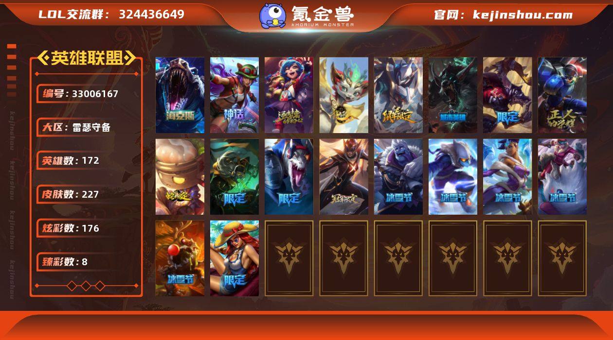 【LOLYH1995】172英雄/227皮肤/4神话/19限定/8臻彩/176炫彩/26传说/50史诗/未定级/10周年 安妮/十五周年纪念 希维尔/10周年庆典 凤凰/海克斯 雷克顿/无畏骑士 瑟庄妮 赤子初心/冠军典狱长 锤石 凯旋圣装/冠军之血 希瓦娜 凯旋圣装/霸天战士 雷恩加尔 星啸天火/西部魔影 卢锡安 贝利尔之怠/黎明使者 锐雯 黑夜使者/可爱可爱粉红红 布里茨/魔女 阿卡丽 虚荣/王国机神苍狼 瑟提/天龙之子 斯莫德/点心宝贝 阿木木/觅心女王 寒冰/冰封王子 蒙多/冬季仙境 卡尔玛/圣诞驯鹿 克格莫/魄罗骑士 瑟庄妮/冰雪节 炼金/冰雪节 马尔扎哈/S1FNC 卡尔萨斯/S5 SKT T1 雷克顿/S9 FPX 薇恩/暗裔英雄 盖伦/魅惑女巫 悠米/泳池派对 厄运小姐/暗影 沃里克/都铎王朝 图奇/防暴天使 凯尔/地狱之门卫士 加里奥/血石领主 弗拉基米尔/大天使长米迦勒 凯尔/恶魔男爵 瑞兹/提莫:"约德尔人的一大步"/女皇 艾希/恶魔之刃 泰达米尔/黯晶凤凰 艾尼维亚/律政大亨 蒙多/电玩女神 娑娜/神拳 李青/神龙尊者 圣龙李青/驯龙学者 黑默丁格/炼狱魔犬 内瑟斯/黎明使者 锐雯/星之守护者 拉克丝/宇航员 诺提勒斯/泳池派对 吉格斯/金牌主播 德莱文/霸天异形 卡兹克/神王 德莱厄斯/心之钢 凯隐/黑夜使者 亚索/神龙尊者 昼日真...