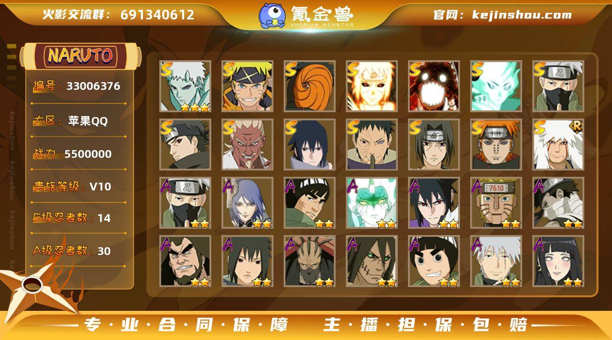 实名: 可修改 贵族等级: V10 S忍数: 14 A忍数: 30 战力值(万): 550 S级忍者: 佩恩「天道」,宇智波鼬 「须佐能乎」,宇智波带土 「忍界大战」,自来也 「舞之豪杰」,宇智波佐助「永恒万花筒」,艾「忍界大战」,宇智波止水「须佐能乎」,旗木卡卡西「须佐能乎」,大筒木舍人 「最终章」,漩涡鸣人 「暴怒·第六尾」,波风水门「九喇嘛连结」,宇智波斑「五影会谈」,漩涡鸣人·宇智波佐助,宇智波带土「十尾人柱力」 通灵兽: 熊猫