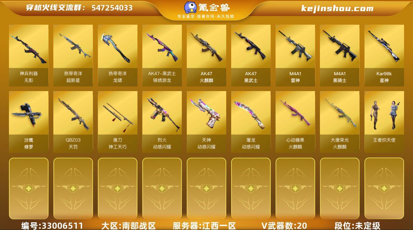 江西一区-18V-0王者武器数-0炫金武器数 【热门武器】:Kar98K-星神,M4A1-黑骑士,沙鹰-修罗 【皮肤】:雷神-维纳斯皮肤,火麒麟-大唐荣光,火麒麟-心动糖果 【角色】:王者炽天使,奇洋探员,乔伊教练,云海玲珑,暗夜-X,暗夜审判,电竞少女,飞虎队-X,风暴女,虎妞,嘉年华灵狐,娟娟,麻雀,曼陀罗-X,潘多拉-X,潘多拉-甜心教官,斯沃特-X,蜀雪,兔囡囡,游珑儿 【人偶武器】:AWM-灵狐-15周年嘉年华,迷你深渊冰龙*2,迷你波特博士,夺魂*2,迷你牛牛,生化手雷-机甲核心*2,迷你巨石泰坦-魔花研究所 【暴走生化】:黑龙吞噬者,超级对讲机 【挑战大师】:冰龙粉碎者-白马银枪,神圣爆裂者-末日III 【英雄级武器】:AK47-火麒麟,M4A1-雷神,M4A1-黑骑士,AK47-黑武士,QBZ03-天罚,无影-神兵利器,黑武士-锦绣游龙,超新星-热带奇洋,烈火-动感闪耀,Kar98K-星神,沙鹰-修罗,天神-动感闪耀,唐刀-神工天巧,屠龙-动感闪耀,龙啸-热带奇洋,手雷-动感闪耀,手雷-热带奇洋,闪光弹-神工天巧,烟雾弹-神工天巧*2,AK47-竞魂无影,AN94-竞魂超新星 【源级武器】:源-黑龙,御·黑龙-龙太子,源·雷神,魂·雷神-神秘按键,魂·雷神-维纳斯,魂·雷神-新春神龙,魂-雷神-萌杀...