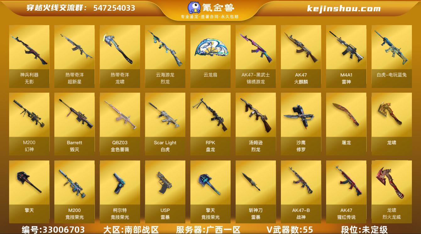 广西一区-64V-14王者武器数-0炫金武器数 【热门武器】:QBZ03-金色蔷薇,Scar Light-白虎,M200-幻神,M200-竞技荣光,白虎-电玩蓝兔,汤姆逊-烈龙*6,RPK-盘龙,加特林-炼狱,斯泰尔-蝴蝶,USP-雷暴,沙鹰-修罗 【王者炫金武器】:高爆手雷-雷霆王者*4,烟雾弹-雷霆王者,闪光弹-雷霆王者 【音效卡】:M4A1-雷神音效卡,Barrett-毁灭音效卡,QBZ03-金色蔷薇音效卡 【皮肤】:幻神-电竞之星 皮肤,白虎-电玩粉兔皮肤,QBZ03-荣耀世冠EP 皮肤,雷神-动感闪耀 皮肤,雷神-神秘按键 皮肤,火麒麟-雷神,毁灭-CFS2020,战神-粉色甜心皮肤,战神-流金岁月皮肤*2,屠龙-荣耀世冠AG 【角色】:葵,电竞教官-云悠悠,奇洋探员,乔伊教练,云海玲珑,幻面灵狐,暗夜-X,初恋灵狐,电竞少女,飞虎队-X,虎妞,嘉年华灵狐,娟娟,灵狐者-X,灵狐者-七夕宝贝,曼陀罗-X,曼陀罗-礼服,潘多拉-X,赛斯-X,斯沃特-X,兔囡囡,维纳斯,新娜塔莎,游珑儿,团团 【人偶武器】:斯泰尔-蝴蝶,AWM-灵狐-15周年嘉年华*2,迷你深渊冰龙,迷你波特博士*2,夺魂*2,生化手雷-机甲核心*3,深渊终结者手雷*2,迷你超能女侍,迷你巨石泰坦-魔花研究所,灵狐娃娃手雷*2 【暴走生化】:超级对讲机 【挑战大...