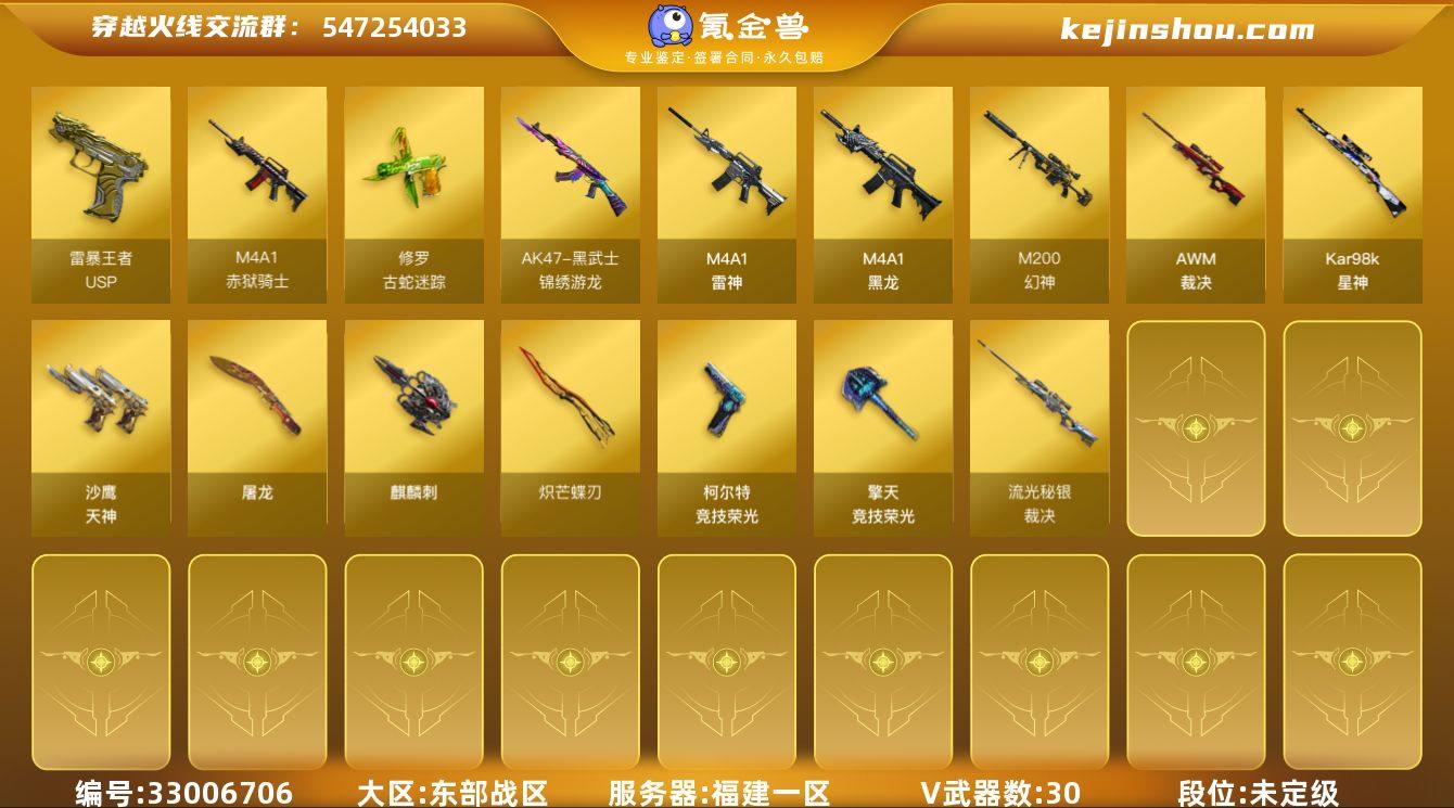 福建一区-30V-7王者武器数-0炫金武器数 【传说武器】:神威天绫 【热门武器】:M14EBR-玄武,M200-幻神,修罗-古蛇迷踪,Kar98K-星神,斯泰尔-蝴蝶,炽芒蝶刃 【王者炫金武器】:USP-雷暴王者*2,王者之魄烟雾弹 【皮肤】:幻神-纸灯龙皮肤,裁决-流光秘银,星神-巅峰荣耀 皮肤 【角色】:战地猎狐,蛇隐宗,乔伊教练,斗烈龙骑,风暴女,娟娟,龙儿,潘多拉-X,潘多拉-甜心教官,蛇姬,新娜塔莎 【人偶武器】:斯泰尔-蝴蝶,生化手雷-机甲核心 【英雄级武器】:M4A1-黑龙,M4A1-雷神,M14EBR-玄武,黑武士-锦绣游龙,天罚-斗烈龙驹,AWM-裁决,M200-幻神,Kar98K-星神,沙鹰-天神*2,柯尔特-竞技荣光,修罗-古蛇迷踪,屠龙,麒麟刺,擎天-竞技荣光*2,炽芒蝶刃,屠龙-斗烈龙驹,高爆手雷-竞技荣光*2,高爆手雷-古蛇迷踪,高爆手雷-雷暴王者*3,闪光弹-竞技荣光*3,闪光弹-量子之心,烟雾弹-竞技荣光*3,烟雾弹-古蛇迷踪,烟雾弹-雷暴王者,M4A1-赤狱骑士 【其他武器】:源·火麒麟,御·黑龙-龙太子,源·雷神*2,魂·雷神-萌柴,源·黑骑士,魂·黑骑士-幻能朋克,魂·黑骑士-娜塔莉娅,御·黑骑士·哪吒闹海*2,魂-死神-机甲核心,源·AK47-黑武士,源·机械迷城,魂·HK417-朱雀-凤灵*...