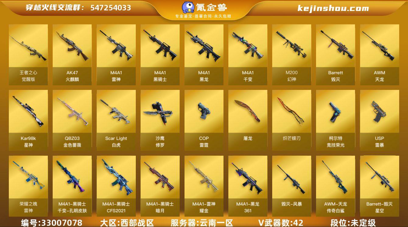 云南一区-49V-6王者武器数-0炫金武器数 【热门武器】:QBZ03-金色蔷薇,Scar Light-白虎,M200-幻神,Kar98K-星神,M4A1-黑骑士,USP-雷暴,沙鹰-修罗*3,炽芒蝶刃,炽芒蝶刃-破浪逐光 皮肤 【王者炫金武器】:高爆手雷-雷霆王者 【音效卡】:M4A1-雷神音效卡 【皮肤】:金色蔷薇-量子蔷薇 皮肤,雷神-荣耀之魄,雷神-耀金皮肤,AK47-火麒麟-传奇EVEN,毁灭耀金皮肤,毁灭-星空,毁灭-风暴,M4A1-千变-孔明皮肤,M4A1-黑龙-361,黑骑士-暗月,黑骑士-CFS2021,AWM-天龙-传奇白鲨,修罗-星空,屠龙-荣耀之锋,屠龙-破浪逐光 皮肤*2,炽芒蝶刃-破浪逐光 皮肤 【角色】:葵,炫,王者春,乔伊教练,修道士,初恋灵狐,虎妞,嘉年华灵狐,灵狐者-黄金海岸,潘多拉-X,蜀雪,铁骑荣耀,新娜塔莎,雪莉杨,雪莉杨-摸金校尉 【人偶武器】:迷你艾比 【暴走生化】:超级对讲机 【英雄级武器】:M4A1-千变,AK47-火麒麟,M4A1-黑龙,M4A1-雷神,M4A1-黑骑士,Scar Light-白虎,QBZ03-金色蔷薇,王者之心-觉醒版,AWM-天龙,Barrett-毁灭*2,M200-幻神,Kar98K-星神,沙鹰-修罗*3,USP-雷暴,COP-雷霆*2,柯尔特-竞技荣光*2,屠龙*3,炽芒蝶刃,王者之锋-觉醒版,雷霆王者之锋-觉醒版,...