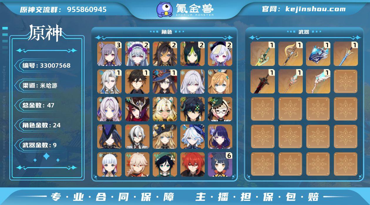 47黄! 冒险等级: 60 3命金色角色: 三命刻晴 2命金色角色: 二命七七,二命提纳里,二命迪希雅,二命梦见月瑞希 1命金色角色: 一命钟离,一命莫娜,一命那维莱特 0命金色角色: 迪卢克,温迪,枫原万叶,神里绫华,雷电将军,芙宁娜,娜维娅,阿蕾奇诺,克洛琳德,艾梅莉埃,基尼奇,希诺宁,恰斯卡,茜特菈莉,爱可菲,丝柯克 拥有武器: 狼的末路,天空之翼,天空之脊,苍古自由之誓,万世流涌大典,裁断,山王长牙 1精武器: 狼的末路,天空之翼,天空之脊,苍古自由之誓,万世流涌大典,裁断,山王长牙