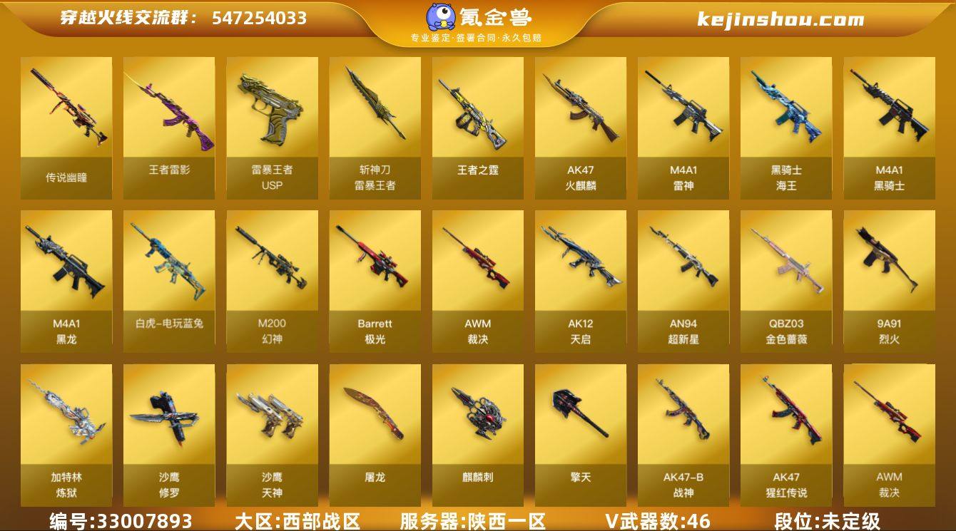 陕西一区-53V-21王者武器数-0炫金武器数 【传说武器】:传说幽瞳 【传说角色】:传说星骇 【热门武器】:传说幽瞳,QBZ03-金色蔷薇,M200-幻神,修罗-古蛇迷踪,白虎-电玩蓝兔,QBZ03-街机,牛牛-AK47,M4A1-黑骑士,加特林-炼狱,羊驼玩偶*2,沙鹰-修罗,COP 357-极地霜雄 【王者炫金武器】:AK47-雷暴王者,王者雷影,王者凌虎,王者星魄,王者之霆,USP-雷暴王者*2,斩神刀-雷暴王者 【音效卡】:AK47-火麒麟音效卡,M4A1-黑龙音效卡,AWM-裁决音效卡,枪娘语音包-阿敏,QBZ03-天罚音效卡,麒麟刺-百战金芒-盛典舞曲音效卡,炼狱-百战金芒-庆典舞曲音效卡 【皮肤】:幻神-丹凤,幻神-星耀 皮肤,幻神-动感闪耀 皮肤,幻神-电竞之星 皮肤,金色蔷薇-纸灯龙皮肤,AWM-裁决-百城联赛天津皮肤,裁决-叶芒苍灵 皮肤,裁决-胜者为王 皮肤,裁决-星际旅行 皮肤,雷神-暗月,雷神-虎将,雷神-荣耀世冠AG,雷神-宇航兔皮肤,雷神-CFS十周年纪念版 皮肤,雷神-动感闪耀 皮肤,雷神-海滩派对 皮肤,M4A1-雷神-拼搏,雷神-化蛇 皮肤,火麒麟-雷神,火麒麟-轻羽皮肤,巴雷特-虎牙平台皮肤,黑龙-墨子皮肤,黑龙-冠军之武,黑骑士-暗月,黑骑士-AG-S4冠军典藏,天启-暗月,天启-高能霹雳...