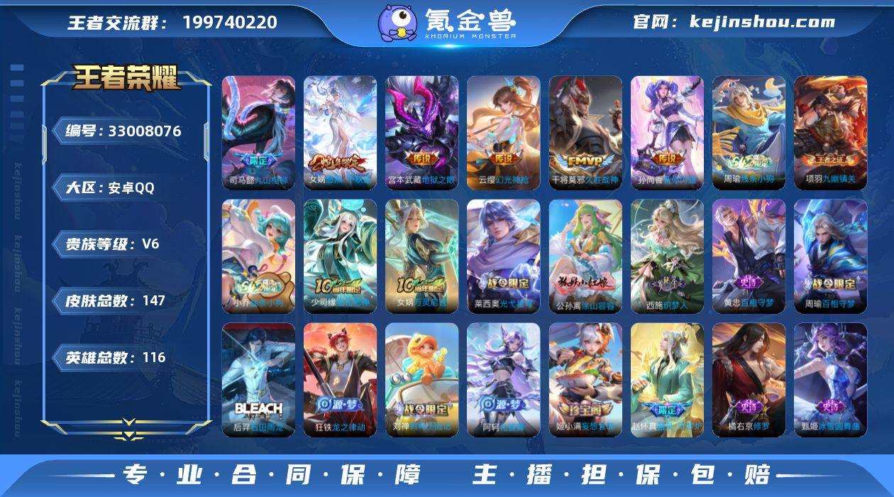 MCK632801 【愿照女娲!九山相柳!】 皮肤数量147 印记总数8 【V6】 【最强王者】 【不可修改】 账号类型3 传说6 史诗51 账号类型:打野号,软辅号,中单号; 传说:宫本武藏_地狱之眼,干将莫邪_久胜战神,司马懿_九山相柳,云缨_幻光神枪,女娲_愿照千秋盛,孙尚香_音你闪耀; 史诗:小乔_线条小狗,镜_玫瑰异探,周瑜_线条小狗,项羽_九幽镇关,夏侯惇_乘风破浪,李白_千年之狐,莱西奥_光弋星穹,嬴政_摇滚巨星,孙尚香_水果甜心,少司缘-巫礼祀神,嬴政_优雅恋人,橘右京_修罗,女娲-万灵启世,公孙离_涂山容容,阿珂_节奏热浪,西施_织梦人,周瑜_百相守梦,宫本武藏_鬼剑武藏,赵云_皇家上将,黄忠-百相守梦,后羿_石田雨龙,杨戬_天秀启明,刘邦_德古拉伯爵,妲己_女仆咖啡,百里玄策_原初追逐者,刘禅_鸭鸭历险记,狂铁_龙之律动,阿珂_化蝶舞,铠_曙光守护者,孙膑_茶境仙,程咬金_功夫厨神,赵怀真_器灵浮梦炉,伽罗_箭羽风息,百里守约_特工魅影,露娜_紫霞仙子,百里守约_百相守梦,花木兰_水晶猎龙者,白起_星夜王子,甄姬_冰雪圆舞曲,张飞_乱世虎臣,貂蝉_圣诞恋歌,狄仁杰_鹰眼统帅,吕布_末日机甲,姬小满_妄想食味,廉颇_地狱岩魂,王昭君_偶像歌手,亚瑟_...