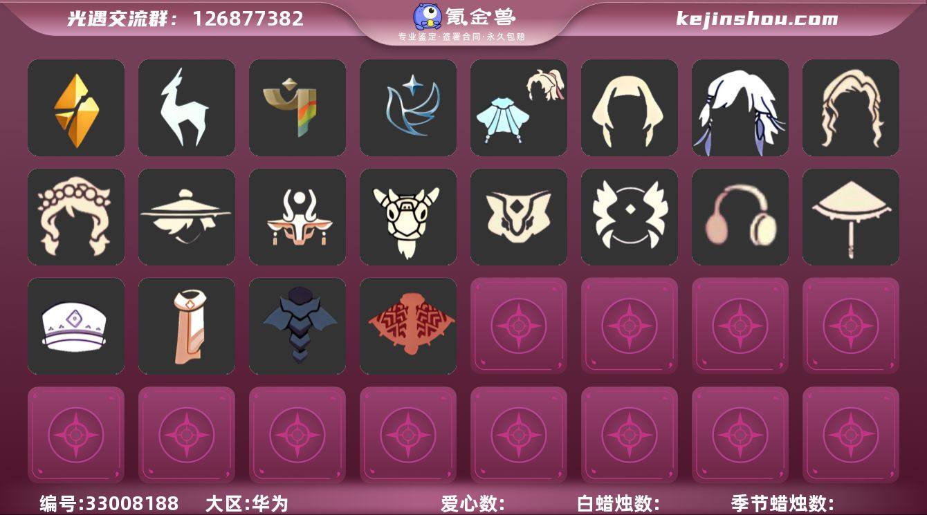 爱心数:12/晨岛/云野/雨林/破晓季/九色鹿季/彩染季/青鸟季/冥龙斗篷/留辫蘑菇头/五塑彩羽发/九色鹿丸子头/九色鹿丝带裤/九色鹿飞天斗篷/辉光羚羊面具/彩染围巾斗篷/青鸟毕业面饰/青鸟斗篷/青衫落拓礼包/冥龙南瓜/虚荣/花环/红耳机/若笠/平顶帽/黑金斗篷/红金斗篷/雨伞/黄鼠狼/羊头面具/猫猫头/归巢毕业发型/花环长发/玉兔发饰/创始人斗篷/围巾斗篷