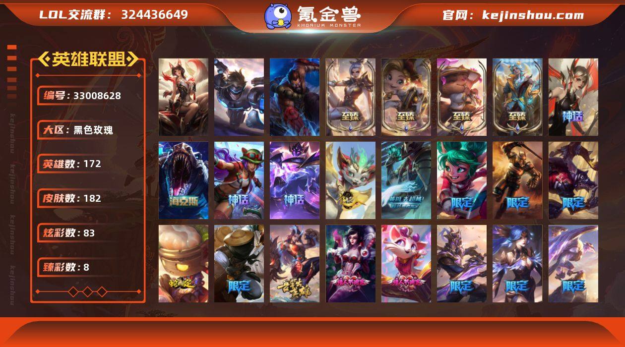 【LOLYH2083】172英雄/182皮肤/2终极/8神话/29限定/8臻彩/83炫彩/22传说/28史诗/铂金/爱意绵绵/觅心之翼奎因/殿堂传奇 阿狸/殿堂传奇 乐芙兰/十五周年纪念 希维尔/水晶巫灵 泽拉斯/至臻 灵魂莲华 提莫/至臻 天龙之子 伊泽瑞尔/至臻 玉剑传说 武剑仙/至臻 奥术师 佐伊/海克斯 雷克顿/无畏骑士 瑟庄妮 赤子初心/征服者 阿利斯塔 炫金/西部魔影 卢锡安 贝利尔之怠/灵魂莲华 锐雯 流火/星之守护者 卡莎 热情之光/可爱可爱粉红红 布里茨/殿堂传奇 乐芙兰 登神/魔女 阿卡丽 虚荣/天龙之子 斯莫德/点心宝贝 阿木木/觅心猎手 薇恩/觅心猫猫 悠米/冬季仙境 发条/雪默丁格/圣诞驯鹿 克格莫/魄罗骑士 瑟庄妮/圣诞老人 布隆/冰雪节 格雷福斯/灵魂守卫/未来战士/养蜂人 辛吉德/地底世界 崔斯特/S3 SKT T1 贾克斯/S3 SKT T1 劫/S4 SSW 雷恩加尔/S5 SKT T1 瑞兹/S5 SKT T1 蜘蛛/S6 SKT T1 奥拉夫/S6 SKT T1 球女/S6 SKT T1 扎克/胜利凤凰 艾尼维亚/胜利之王 泰达米尔/胜利巨口 克格莫/胜利女神 娑娜/胜利剑圣 易/波比的巧克力工坊/都铎王朝 图奇/玉剑传说 舞龙卫/警用试作体K-9 内瑟斯/铁哥们儿 奥拉夫/血石领主 弗拉基米尔/钢铁之翼 凯尔/欧米伽小队 幽灵特工/西部天使 艾希/双重冰晶 艾尼维...