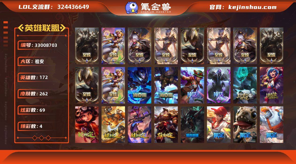【LOLYH2082】172英雄/262皮肤/16神话/32限定/4臻彩/69炫彩/29传说/78史诗/白银/觅心之翼奎因/10周年 安妮/源代码 乐芙兰/十五周年纪念 希维尔/灰烬骑士 派克/至臻 源计划:正义 艾瑞莉娅/至臻 源计划正义 艾瑞莉娅(2022)/至臻 电玩女神 凯特琳/至臻 电玩女神 凯特琳(2022)/至臻 黑夜使者 李青/至臻 黑夜使者 李青(2022)/至臻 玉剑传说 武剑仙/至臻 玉剑传说 武剑仙(2022)/至臻 腥红之月 亚托克斯/至臻 腥红之月 亚托克斯(2022)/海克斯 阿利斯塔/海克斯 嘉文四世/无畏骑士 瑟庄妮 赤子初心/征服者 韦鲁斯 炫金/魔女 阿卡丽 虚荣/净雪之月 莫甘娜 冬虹/“你看见过我的熊猫吗?” 安妮/美猴王 孙悟空/玉净夜叉 凯特琳/张辽 文远/龙马烈焰波比/觅心女王 寒冰/圣诞狂欢 努努/魄罗骑士 瑟庄妮/寒冬精灵 璐璐/冰雪节 炼金/冰雪女神 辛德拉/送披萨的小姐姐 希维尔/斩星魔剑 易/冠军典狱长 锤石/冠军之血 希瓦娜/S2 暗杀星 蒙多/S3 SKT T1 贾克斯/S3 SKT T1 劫/S4 SSW 泰隆/S6 SKT T1 娜美/S10 DWG 凯南/胜利女神 奥莉安娜/胜利之剑 亚托克斯/胜利枪神 卢锡安/胜利女神-菲奥娜/鬼影森森 茂凯/泳池派对 普朗克/暗影 沃里克/都铎王朝 图奇/防暴机器人 布里茨/鸡里奥/克格汪/大天使长米迦勒...