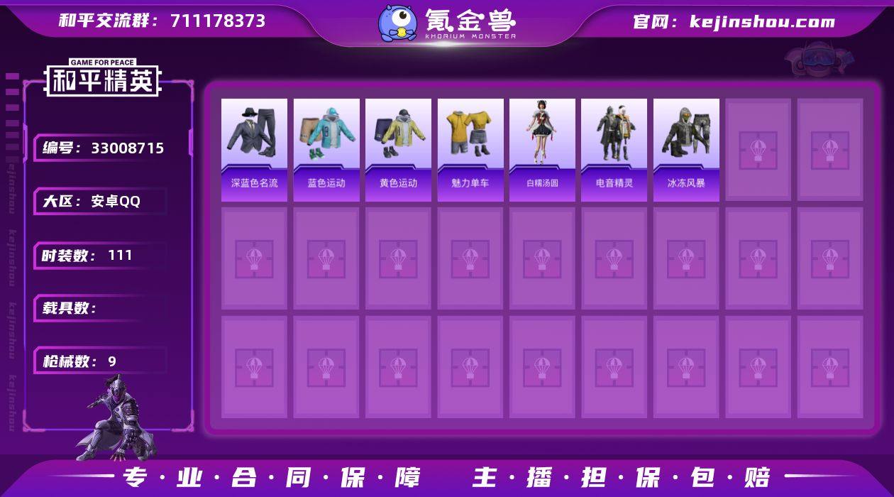 地铁号-1特效枪-无二次协助2978热力值-14套装-9枪皮【稀有武器皮肤】: GROZA-影袭【其他套装】: 白糯汤圆 黄色运动 蓝色运动 深蓝色名流 魅力单车 冰冻风暴 电音精灵【优质降落伞】: 炫彩糖果降落伞 恐龙拽拽降落伞 普通降落伞