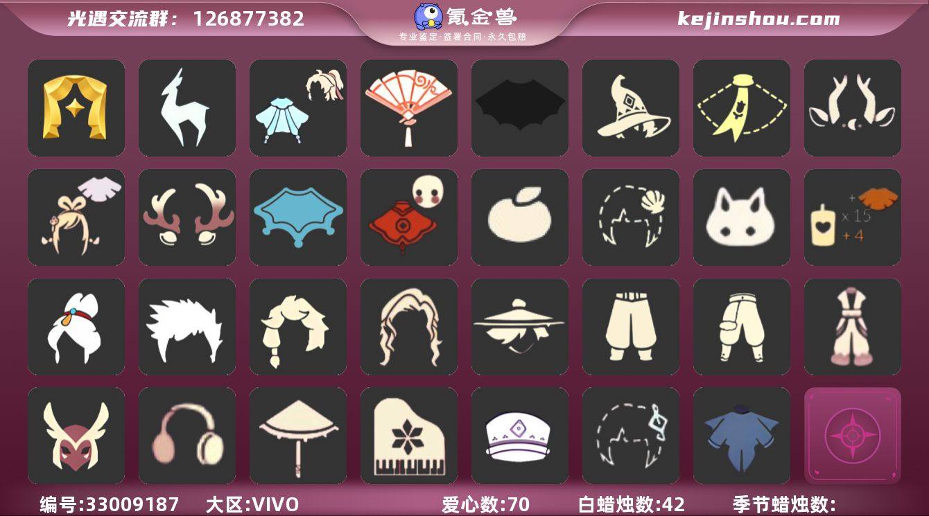 账号类型: 手机账号 季节已毕业: 表演季,九色鹿季 完成地图: 雨林,霞谷 珍稀物品: 白枭 礼包: 蝙蝠套,巫师,围巾,九色鹿角,绊爱,鹿角,瑞雪,福娃,橘子,贝壳,兔子,创始人,献瑞折扇礼包,青衫落拓礼包 裤子: 武士裤,搓澡巾,飞天裤 面具: 黄眉企鹅面具 面饰: 红耳机 发型: 若笠,虚荣,单侧绑发,小王子发型,飞天盘发 头饰: 蓝色音乐会,平顶帽 斗篷: 燕尾斗篷 配饰: 雨伞,高音钢琴 亮点: 【优质装备】:表演季,白枭(帝企鹅发),武士裤,高音钢琴(白色高脚钢琴),九色鹿(九色鹿季),飞天裤(柔缎花边连)(九色鹿丝带裤),黄眉企鹅面具,单侧绑发(单边小辫),小王子发型,燕尾斗篷,飞天盘发(九色鹿丸子头),蝙蝠套(蝙蝠斗篷)(南瓜头),福娃(福娃礼包)(春之日礼包)(铜钱斗),绊爱(绊爱斗篷)(绊爱礼包),红耳机,围巾(小王子斗篷)(小王子围巾),九色鹿角(神鹿祝福头饰)(神鹿祝福礼包),鹿角(圣诞鹿角),瑞雪(瑞雪斗篷)(暖冬瑞雪),巫师(巫师帽),雨林,霞谷,若笠(箬笠),创始人(创始人斗篷),献瑞折扇礼包,青衫落拓礼包,兔子(玉兔头饰)(玉兔发饰)(兔子发饰),橘子(大橘大利),贝壳(贝壳发饰)