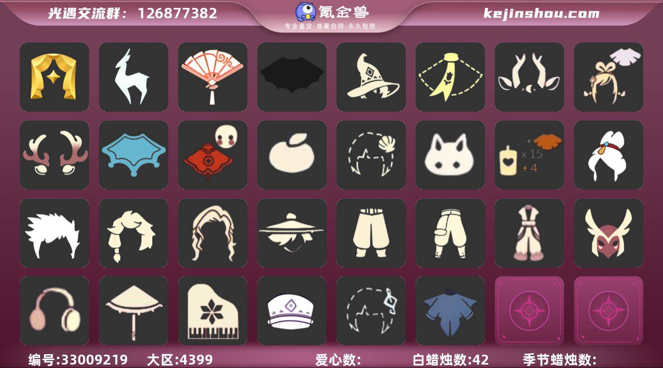 VIVO 手机账号 1珍稀物品 2毕业季 2毕业图 42蜡烛 【珍稀物品】白枭(帝企鹅发) 【季节已毕业】表演季,九色鹿(九色鹿季) 【完成地图】雨林,霞谷 【礼包】巫师(巫师帽),绊爱(绊爱斗篷)(绊爱礼包),橘子(大橘大利),贝壳(贝壳发饰),兔子(玉兔头饰)(玉兔发饰)(兔子发饰),九色鹿角(神鹿祝福头饰)(神鹿祝福礼包),鹿角(圣诞鹿角),创始人(创始人斗篷),围巾(小王子斗篷)(小王子围巾),福娃(福娃礼包)(春之日礼包)(铜钱斗),蝙蝠套(蝙蝠斗篷)(南瓜头),瑞雪(瑞雪斗篷)(暖冬瑞雪),青衫落拓礼包,献瑞折扇礼包 【裤子】飞天裤(柔缎花边连)(九色鹿丝带裤),武士裤,搓澡巾 【面具】黄眉企鹅面具 【面饰】红耳机 【发型】小王子发型,单侧绑发(单边小辫),飞天盘发(九色鹿丸子头),虚荣,若笠(箬笠) 【头饰】平顶帽,蓝色音乐会(蓝色音乐符) 【斗篷】燕尾斗篷 【配饰】雨伞,高音钢琴(白色高脚钢琴)