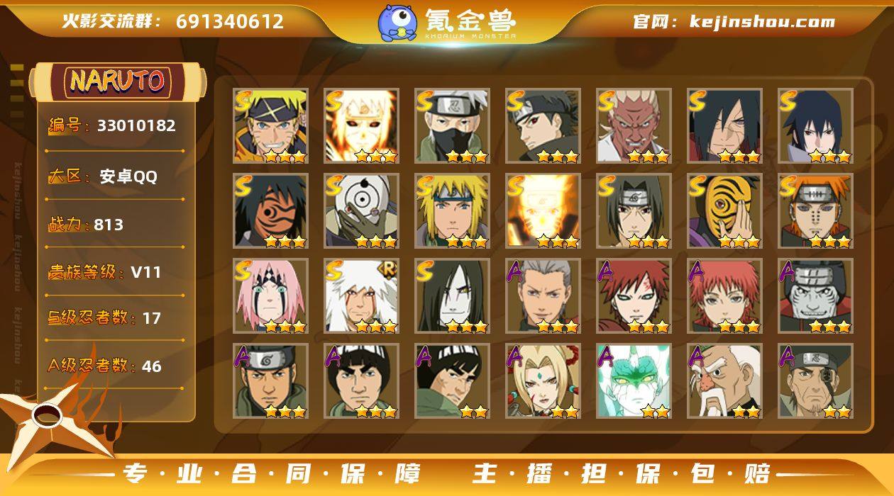 (可免费转苹果)V11,战力813W,17S级忍者数-46A级忍者数,有熊猫,最终章舍人80片,热门A忍卑留呼,侠隐大野木,漂泊六道,暴怒带土等,ME2267 【S级忍者】:宇智波斑「秽土转生·解」(3星),春野樱「忍界大战」(3星),艾「忍界大战」(3星),宇智波鼬「须佐能乎」(3星),宇智波止水「须佐能乎」(3星),旗木卡卡西「须佐能乎」(3星),自来也「舞之豪杰」(3星),大蛇丸(3星),波风水门(3星),神秘面具男(3星),神秘面具男「红夜之刃」(3星),漩涡鸣人「九喇嘛连结」(3星),佩恩「天道」(3星),宇智波佐助「永恒万花筒」(3星),宇智波斑 「白面具」(3星宇智波斑「白面具」),波风水门「九喇嘛连结」(3星),漩涡鸣人·宇智波佐助(3星) 【A级忍者】:艾「青年」(2星),长门「青年」(2星),波风水门「青年」(2星),达鲁伊「博人传」(2星),迪达拉「秽土转生」(2星),大蛇丸「晓」(2星),奇拉比(2星),飞段(3星),飞段「死司凭血」(2星),干柿鬼鲛(3星),漩涡博人「桃式显现」(2星),漩涡鸣人「九尾查克拉」(2星),迈特凯(3星),桃地再不斩(2星),桃地再不斩「秽土转生」(2星),我爱罗「疾风传」(3星),我爱罗「忍界大战」(2星),蝎(3星),蝎「绯流琥」(2星),小南「神驹佑将」(2星)...