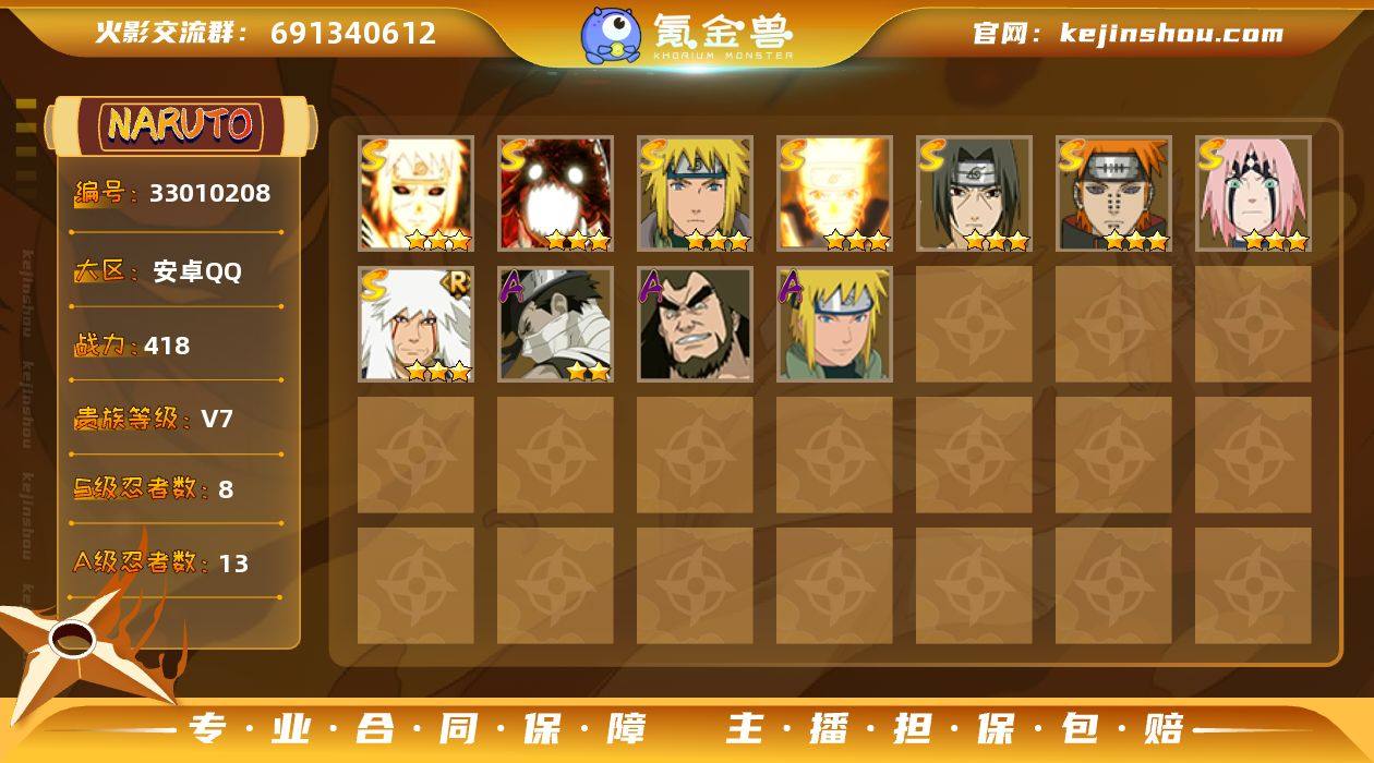 【火影忍者】战斗力:418W+;段位:下忍3阶;VIP:V7级;S忍:8个;A忍:13个;通灵兽:13个,S忍:九喇嘛连结波风水门|天道佩恩|舞之豪杰自来也|波风水门|须佐能乎宇智波鼬|忍界大战春野樱|九喇嘛连结漩涡鸣人|暴怒第六尾漩涡鸣人__A忍:幻之真容旗木卡卡西|青年波风水门|近松十人卫千代|万花筒写轮眼宇智波佐助|死司凭血飞段|地怨虞角都|飞段(普通)|迈特凯(普通)|夏日限定宇智波鼬|秽土转生桃地再不斩|蝎(普通)|宇智波泉奈|羁绊神农__通灵兽:忍犬(普通)|蓝蛇|蛤蟆吉|忍龟|砂之守鹤|镰鼬|猿魔|山椒鱼|蜃|蛤蟆仙人|鲛鲨|蛤蟆健|乌鸦(普通)