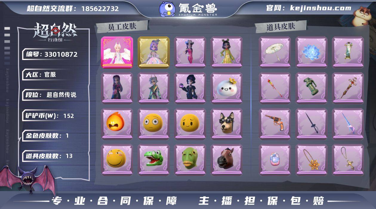 红色皮肤数量: 1 金色皮肤数量: 1 紫色皮肤数量: 5 道具皮肤数量: 13 段位: 超自然传说 外观: 遗失的童话,丝缕哀歌,泽引山海,黑月挽歌,呆滞头套,卑微头套,哈士奇头套,滑稽头套,鳄霸天头套,鱼头怪头套,面具马头套,萨卡班甲鱼头套,驼半仙头套,云梦之星,在逃小新娘,未竟乐园,小小玛丽,呱呱雨衣,火爆了头套,糖果守卫,耀眼的你,炽天使,芝麻糊汤圆