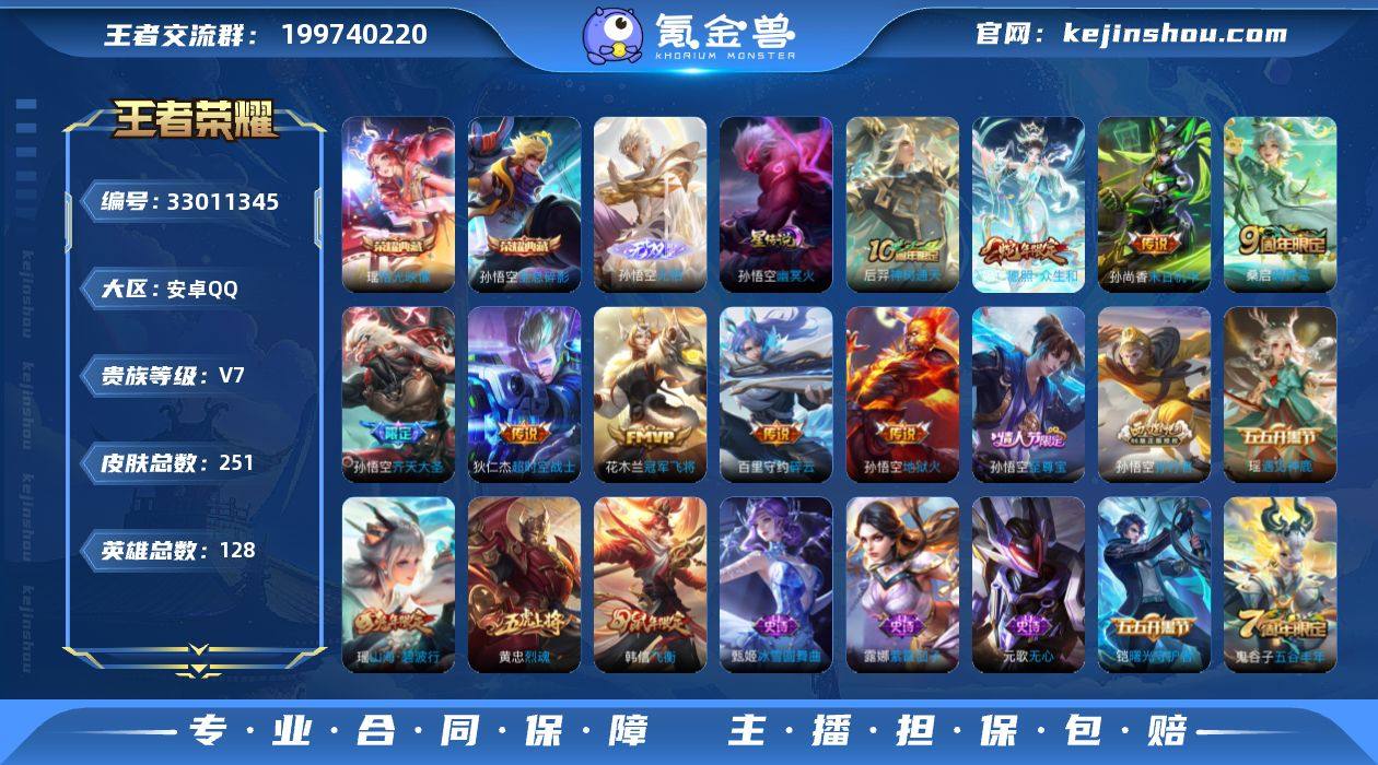V7 2典藏 1无双 11传说 1星元 251皮肤 128英雄 【2水晶】孙悟空-全息碎影,瑶-拾光映像【1无双】孙悟空-无相【11传说】孙悟空-齐天大圣,百里守约-碎云,狄仁杰-超时空战士,花木兰-冠军飞将,孙尚香-末日机甲,孙悟空-地狱火,桑启-鸣野蒿,妲己-愿照·众生和,后羿-神树通天【1星元】孙悟空-幽冥火【46史诗】元歌-无心,鬼谷子-五谷丰年,百里守约-特工魅影,百里玄策-原初追逐者,曹操-幽灵船长,妲己-女仆咖啡,妲己-魅力维加斯,大乔-白蛇,狄仁杰-魔术师,狄仁杰-鹰眼统帅,貂蝉-圣诞恋歌,公孙离-无限星赏官,宫本武藏-鬼剑武藏,韩信-飞衡,花木兰-水晶猎龙者,黄忠-烈魂,铠-曙光守护者,兰陵王-暗隐猎兽者,李白-千年之狐,李元芳-逐浪之夏,廉颇-地狱岩魂,刘邦-德古拉伯爵,刘禅-绅士熊喵,露娜-紫霞仙子,墨子-金属风暴,孙策-猫狗日记,孙尚香-水果甜心,孙悟空-至尊宝,孙悟空-孙行者,王昭君-偶像歌手,西施-诗语江南,小乔-缤纷独角兽,小乔-青蛇,雅典娜-冰冠公主,亚瑟-心灵战警,杨玉环-遇见飞天,嬴政-摇滚巨星,瑶-遇见神鹿,嬴政-优雅恋人,赵云-皇家上将,甄姬-冰雪圆舞曲,甄姬-游园惊梦,钟馗-乐园奇幻夜,瑶-山海·碧波行,暃-星界游侠,镜-青焰无极