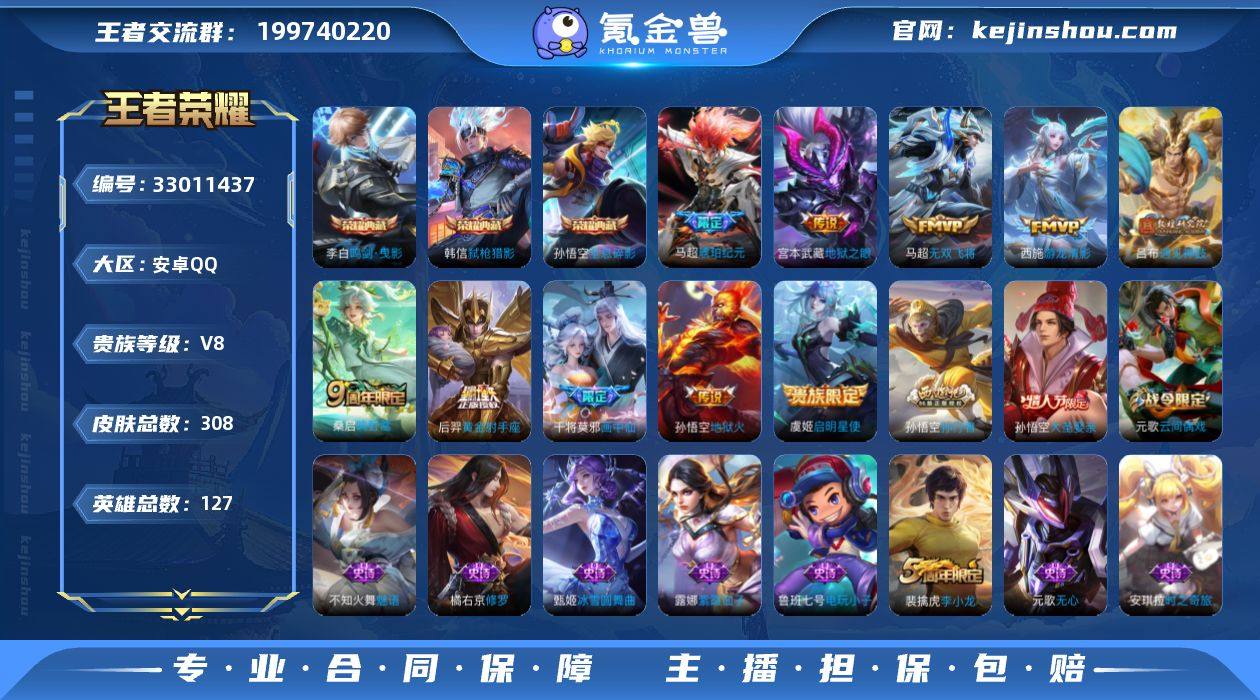 V8 3典藏 11传说 308皮肤 127英雄 【3水晶】李白-鸣剑·曳影,孙悟空-全息碎影,韩信-弑枪猎影【11传说】马超-无双飞将,宫本武藏-地狱之眼,后羿-黄金射手座,孙悟空-地狱火,西施-游龙清影,虞姬-启明星使,干将莫邪-画中仙,吕布-遇见神鼓,马超-琥珀纪元,桑启-鸣野蒿【68史诗】元歌-无心,鬼谷子-五谷丰年,赵云-未来纪元,阿轲-暗夜猫娘,安琪拉-时之奇旅,白起-星夜王子,百里玄策-原初追逐者,百里玄策-热力回旋,不知火舞-魅语,蔡文姬-舞动绿茵,曹操-幽灵船长,嫦娥-拒霜思,程咬金-功夫厨神,妲己-女仆咖啡,妲己-魅力维加斯,狄仁杰-魔术师,狄仁杰-鹰眼统帅,貂蝉-圣诞恋歌,伽罗-箭羽风息,干将莫邪-真爱魔法,宫本武藏-鬼剑武藏,后羿-如梦令,花木兰-水晶猎龙者,橘右京-修罗,黄忠-火炮绅士,兰陵王-暗隐猎兽者,李白-千年之狐,李元芳-逐浪之夏,刘邦-德古拉伯爵,刘禅-绅士熊喵,刘禅-天才门将,露娜-紫霞仙子,鲁班七号-电玩小子,吕布-圣诞狂欢,吕布-末日机甲,米莱狄-胡桃异想国,墨子-金属风暴,上官婉儿-梁祝,裴擒虎-李小龙,司马懿-暗渊魔法,孙策-猫狗日记,孙尚香-水果甜心,孙尚香-蔷薇恋人,孙悟空-大圣娶亲,孙悟空-孙行者,王昭君-偶像歌手,小乔-缤纷独角兽,雅典娜-冰冠公主,雅典娜-黎明之约,亚瑟-心...
