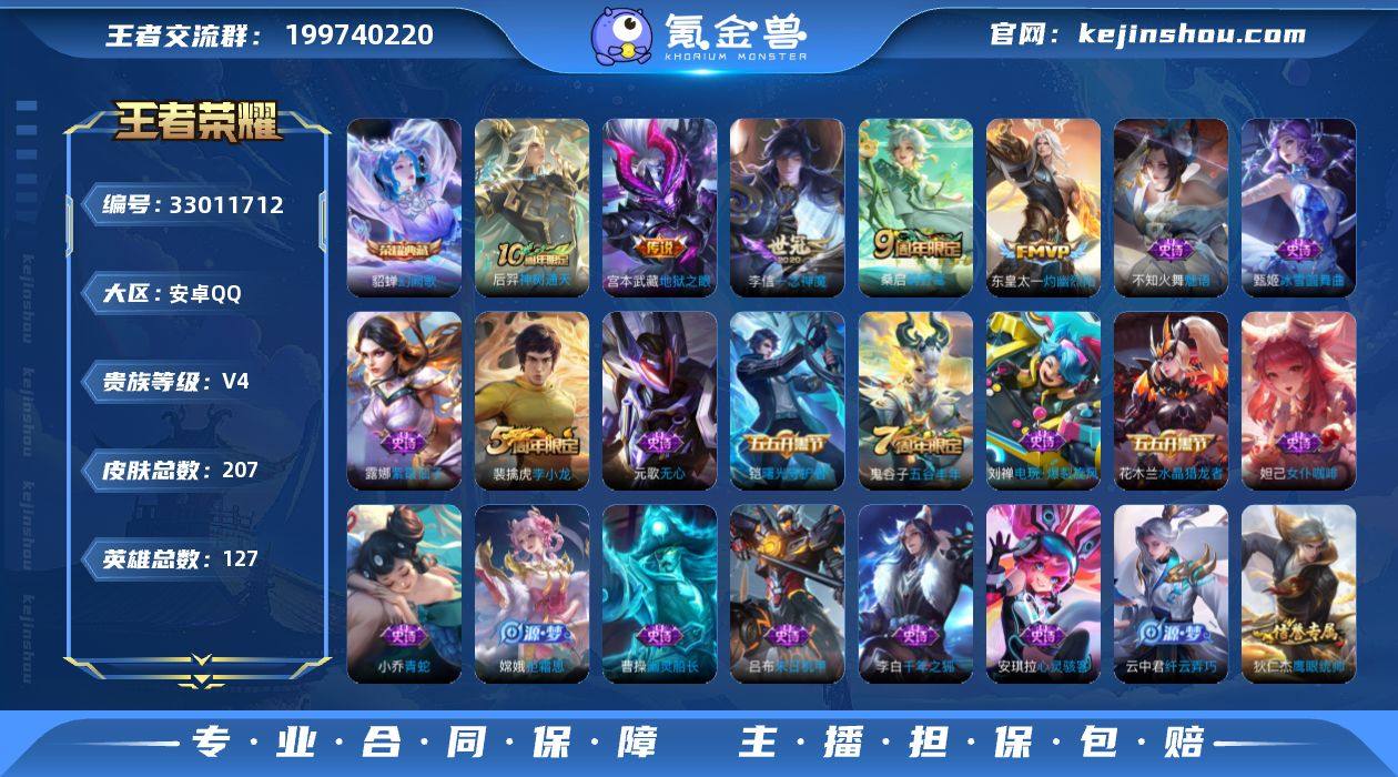 V4 1典藏 6传说 207皮肤 127英雄 【1水晶】貂蝉-幻阙歌【6传说】宫本武藏-地狱之眼,李信-一念神魔,东皇太一-灼幽烈阳,桑启-鸣野蒿,后羿-神树通天【47史诗】元歌-无心,鬼谷子-五谷丰年,赵云-未来纪元,阿轲-节奏热浪,安琪拉-心灵骇客,白起-星夜王子,百里守约-特工魅影,百里玄策-原初追逐者,不知火舞-魅语,蔡文姬-舞动绿茵,曹操-幽灵船长,嫦娥-拒霜思,妲己-女仆咖啡,大乔-猫狗日记,狄仁杰-鹰眼统帅,貂蝉-圣诞恋歌,宫本武藏-鬼剑武藏,花木兰-水晶猎龙者,铠-曙光守护者,兰陵王-暗隐猎兽者,李白-千年之狐,李元芳-逐浪之夏,刘邦-德古拉伯爵,刘禅-绅士熊喵,露娜-紫霞仙子,吕布-圣诞狂欢,吕布-末日机甲,墨子-金属风暴,墨子-龙骑士,裴擒虎-李小龙,沈梦溪-月团寄思,孙尚香-水果甜心,孙尚香-蔷薇恋人,夏侯惇-乘风破浪,项羽-苍穹之光,小乔-缤纷独角兽,小乔-青蛇,雅典娜-冰冠公主,亚瑟-心灵战警,杨玉环-遇见飞天,嬴政-摇滚巨星,云中君-纤云弄巧,甄姬-冰雪圆舞曲,刘禅-电玩·爆裂旋风,蒙犽-百解令,蒙恬-荣光圣徽,弈星-万物之道