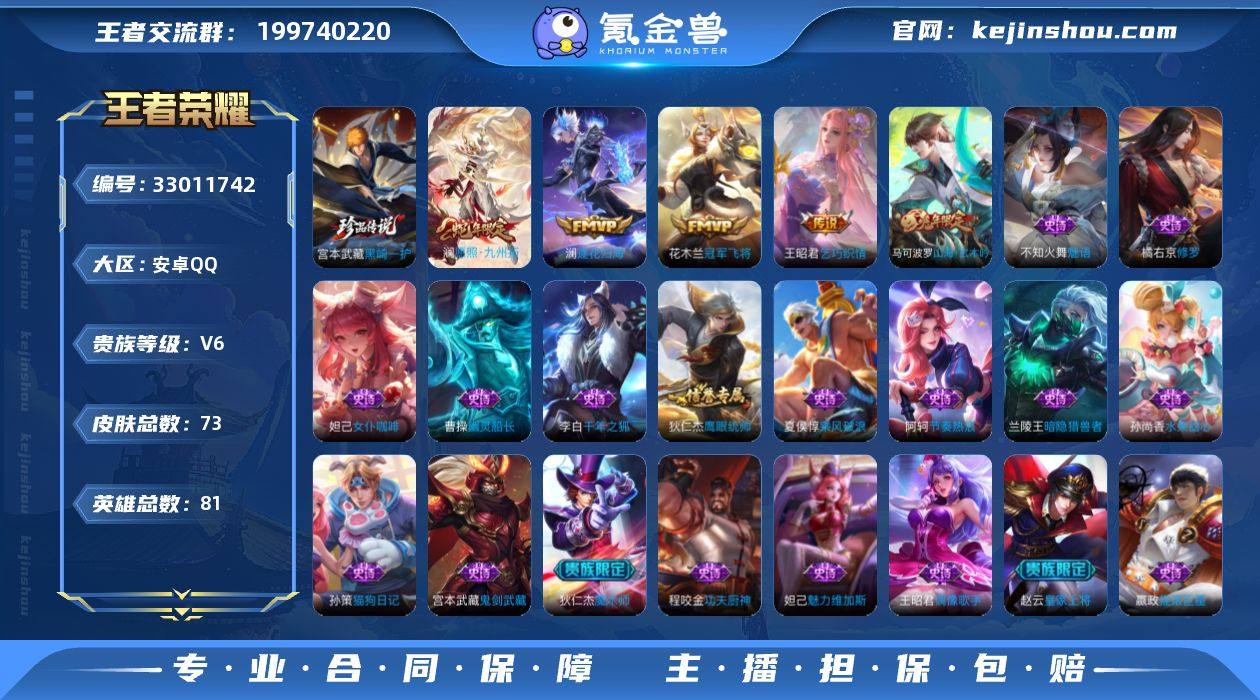 V6 1珍品 7传说 73皮肤 81英雄 【1珍品传说】宫本武藏-黑崎一护【7传说】花木兰-冠军飞将,王昭君-乞巧织情,澜-逐花归海,澜-愿照·九州拓【19史诗】阿轲-节奏热浪,不知火舞-魅语,曹操-幽灵船长,程咬金-功夫厨神,妲己-女仆咖啡,妲己-魅力维加斯,狄仁杰-魔术师,狄仁杰-鹰眼统帅,宫本武藏-鬼剑武藏,橘右京-修罗,兰陵王-暗隐猎兽者,李白-千年之狐,孙策-猫狗日记,孙尚香-水果甜心,王昭君-偶像歌手,夏侯惇-乘风破浪,嬴政-摇滚巨星,赵云-皇家上将,马可波罗-山海·玄木吟