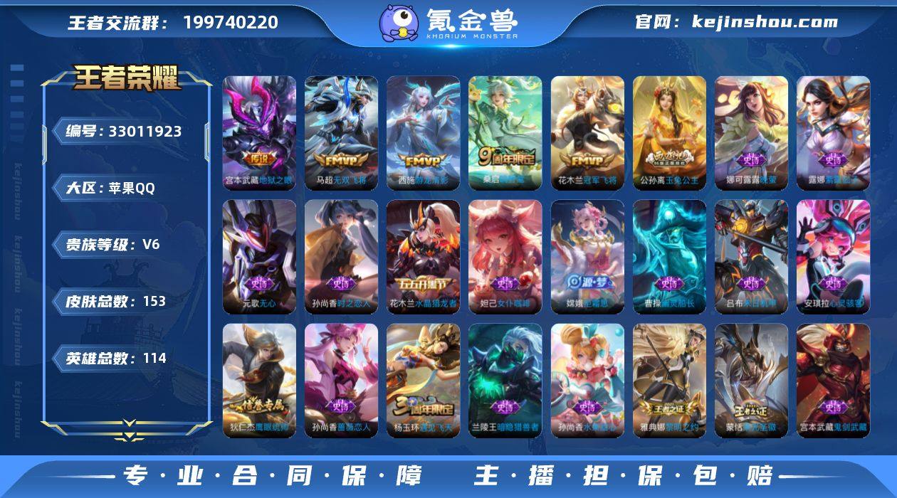 V6 153皮肤 114英雄 【28史诗】元歌-无心,公孙离-玉兔公主,安琪拉-心灵骇客,曹操-幽灵船长,嫦娥-拒霜思,妲己-女仆咖啡,妲己-魅力维加斯,狄仁杰-魔术师,狄仁杰-鹰眼统帅,貂蝉-圣诞恋歌,宫本武藏-鬼剑武藏,花木兰-水晶猎龙者,兰陵王-暗隐猎兽者,廉颇-地狱岩魂,刘禅-天才门将,露娜-紫霞仙子,吕布-圣诞狂欢,吕布-末日机甲,娜可露露-晚萤,孙尚香-水果甜心,孙尚香-蔷薇恋人,孙尚香-时之恋人,雅典娜-黎明之约,杨玉环-遇见飞天,嬴政-摇滚巨星,赵云-皇家上将,蒙犽-百解令,蒙恬-荣光圣徽