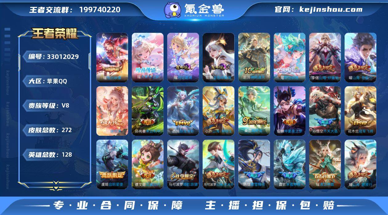V8 1典藏 1珍品 15传说 2星元 272皮肤 128英雄 【1水晶】瑶-拾光映像【1珍品传说】瑶-大耳狗之梦【15传说】曜-山海·苍雷引,小乔-山海·琳琅生,孙悟空-齐天大圣,李信-山海·炽霜斩,蔡文姬-花朝如约,貂蝉-仲夏夜之梦,花木兰-冠军飞将,孙尚香-末日机甲,西施-游龙清影,瑶-时之祈愿,虞姬-启明星使,桑启-鸣野蒿,西施-续相思,后羿-神树通天【2星元】瑶-时之愿境,貂蝉-金色仲夏夜之梦【69史诗】元歌-无心,鬼谷子-五谷丰年,赵云-未来纪元,阿轲-节奏热浪,安琪拉-心灵骇客,白起-星夜王子,百里玄策-原初追逐者,百里玄策-热力回旋,不知火舞-魅语,蔡文姬-舞动绿茵,曹操-幽灵船长,蔡文姬-繁星吟游,嫦娥-拒霜思,程咬金-功夫厨神,妲己-女仆咖啡,妲己-魅力维加斯,大乔-猫狗日记,狄仁杰-魔术师,狄仁杰-鹰眼统帅,貂蝉-圣诞恋歌,伽罗-箭羽风息,宫本武藏-鬼剑武藏,韩信-飞衡,韩信-傲雪梅枪,花木兰-水晶猎龙者,橘右京-修罗,兰陵王-暗隐猎兽者,廉颇-地狱岩魂,刘禅-绅士熊喵,刘禅-天才门将,露娜-紫霞仙子,鲁班七号-电玩小子,吕布-圣诞狂欢,吕布-末日机甲,马可波罗-暗影游猎,墨子-金属风暴,娜可露露-晚萤,裴擒虎-李小龙,孙膑-天狼运算者,孙尚香-水果甜心,王昭君-偶像歌手,西施-诗语江南,夏侯惇-乘风破浪,项...