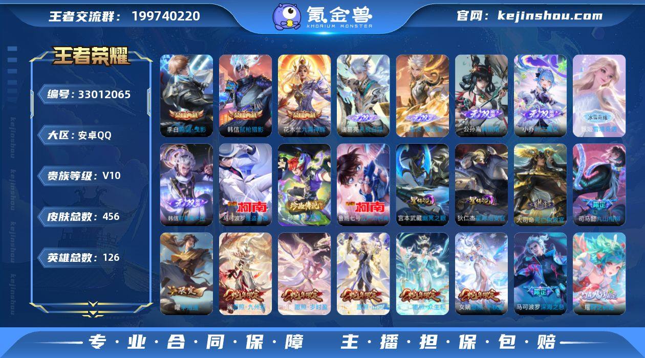 V10 3典藏 7无双 3珍品 53传说 2星元 456皮肤 126英雄 【3水晶】花木兰-九霄神辉,李白-鸣剑·曳影,韩信-弑枪猎影【7无双】小乔-时之魔女,韩信-群星魔术团,公孙离-离恨烟,甄姬-雪境奇遇,曜-器灵·螭龙剑,诸葛亮-天机白泽【3珍品传说】马可波罗-怪盗基德,鲁班七号-江户川柯南,孙策-时之奇旅【53传说】曜-山海·苍雷引,小乔-山海·琳琅生,孙悟空-齐天大圣,李信-山海·炽霜斩,李白-诗剑行,橘右京-枫霜尽,娜可露露-前尘镜,马可波罗-深海之息,马超-无双飞将,达摩-黄金狮子座,狄仁杰-超时空战士,貂蝉-遇见胡旋,干将莫邪-久胜战神,宫本武藏-地狱之眼,后羿-黄金射手座,花木兰-冠军飞将,镜-炽阳神光,铠-绛天战甲,李信-一念神魔,吕布-天魔缭乱,梦奇-胖达荣荣,孙策-末日机甲,孙尚香-异界灵契,孙悟空-地狱火,王昭君-乞巧织情,武则天-海洋之心,瑶-时之祈愿,曜-李逍遥,虞姬-启明星使,张良-黄金白羊座,赵云-淬星耀世,诸葛亮-武陵仙君,吕布-怒海麟威,宫本武藏-惊梅引,兰陵王-影龙天霄,张飞-百相守梦,艾琳-觅芳踪,澜-逐花归海,铠-冥王哈迪斯,曜-云鹰飞将,桑启-鸣野蒿,妲己-愿照·众生和,司空震-愿照·山河定,蔡文姬-愿照·福禄聚,虞姬-愿照·岁时盈,澜-愿照·九州拓,女娲-愿照·千秋盛,大司命-死亡执政官,司...