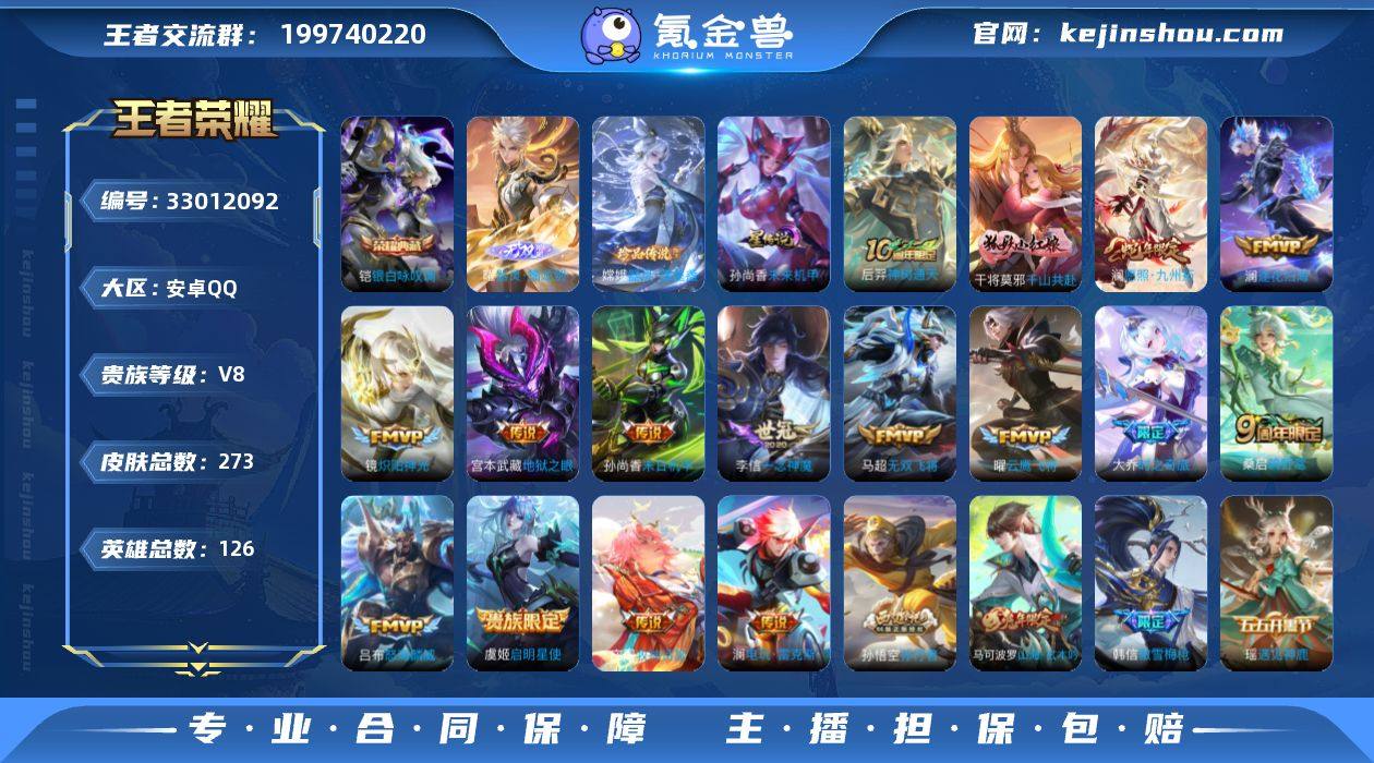 V8 1典藏 1无双 1珍品 20传说 1星元 273皮肤 126英雄 【1水晶】铠-银白咏叹调【1无双】曜-器灵·螭龙剑【1珍品传说】嫦娥-器灵·落星盏【20传说】马超-无双飞将,宫本武藏-地狱之眼,镜-炽阳神光,李信-一念神魔,孙尚香-末日机甲,虞姬-启明星使,吕布-怒海麟威,澜-电玩·雷克斯,大乔-时之奇旅,澜-逐花归海,曜-云鹰飞将,庄周-牧神诗旅,桑启-鸣野蒿,澜-愿照·九州拓,干将莫邪-千山共赴,后羿-神树通天【1星元】孙尚香-未来机甲【50史诗】元歌-无心,鬼谷子-五谷丰年,赵云-未来纪元,狂铁-电玩高手,澜-赏金猎手,夏洛特-永昼,安琪拉-心灵骇客,安琪拉-时之奇旅,白起-星夜王子,百里守约-特工魅影,不知火舞-魅语,曹操-幽灵船长,程咬金-功夫厨神,妲己-女仆咖啡,妲己-魅力维加斯,大乔-猫狗日记,狄仁杰-魔术师,狄仁杰-鹰眼统帅,貂蝉-圣诞恋歌,宫本武藏-鬼剑武藏,韩信-傲雪梅枪,花木兰-水晶猎龙者,花木兰-瑞麟志,橘右京-修罗,铠-曙光守护者,兰陵王-暗隐猎兽者,李白-千年之狐,李元芳-逐浪之夏,李元芳-银河之约,露娜-紫霞仙子,蒙犽-狂想玩偶喵,墨子-金属风暴,墨子-龙骑士,裴擒虎-李小龙,孙策-猫狗日记,孙尚香-水果甜心,孙尚香-蔷薇恋人,孙悟空-孙行者,王昭君-偶像歌手,夏侯惇-乘风破浪,小乔-缤纷独角兽...