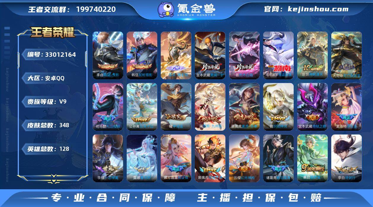 【王者荣耀】珍品无双0 典藏2 无双1 珍品传说3 传说26 史诗95 英雄128 皮肤348 贵族8级 荣耀典藏:鸣剑·曳影|弑枪猎影__无双皮肤:器灵·螭龙剑__珍品传说:怪盗基德|朽木白哉|黑崎一护__传说皮肤:鸣野蒿|前尘镜|炽阳神光|启明星使|胖达荣荣|地狱之眼|狄仁杰-超时空战士|黄金白羊座|猫影幻舞|一念神魔|李逍遥|浮生妄|鹤羽星尊|马超-琥珀纪元|诗剑行|霜月吟|影龙天霄|逐花归海|寅虎·赤拳|幻光神枪|祥瑞亨通|愿照·九州拓|云诺千山|九山相柳|死亡执政官|神树通天__稀有限定:引擎之心|蔷薇恋人|蜜橘之夏|神威|李小龙|狮舞东方|暗影游猎|大漠名商|古海寻踪|海滩派对|华丽摇滚|皇家上将|剑破天穹|江河有灵|黎明之约|迷踪丽影|魔术师|擒涛扼浪|青焰无极|驱傩正仪|探海日志|饕餮|醍醐杖|阿古朵-顽趣|万华元夜|妄想食味|无心|五谷丰年|驯魔猎人|演武夺筹|阴阳师|原初追逐者|云间偶戏|逐梦之翼|暗夜猫娘|暗隐猎兽者|暗渊魔法|白蛇|缤纷独角兽|冰冠公主|冰雪圆舞曲|乘风破浪|德古拉伯爵|地狱岩魂|功夫厨神|鬼剑武藏|箭羽风息|节奏热浪|金属风暴|李元芳-蔬乡物语|魅语|梦奇-顽趣|女仆咖啡|绅士熊喵|圣诞狂欢|圣诞恋歌|水果甜心|水晶猎龙者|孙策-猫狗日记|天秀·启明|晚萤|赵云-未来纪元|星夜王...