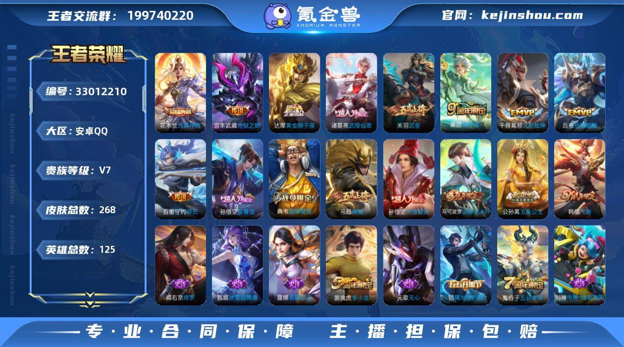 V7 1典藏 9传说 268皮肤 125英雄 【1水晶】花木兰-九霄神辉【9传说】百里守约-碎云,达摩-黄金狮子座,干将莫邪-久胜战神,宫本武藏-地狱之眼,关羽-武圣,诸葛亮-武陵仙君,吕布-怒海麟威,桑启-鸣野蒿【71史诗】元歌-无心,鬼谷子-五谷丰年,赵云-未来纪元,公孙离-玉兔公主,阿轲-节奏热浪,安琪拉-心灵骇客,白起-星夜王子,百里守约-特工魅影,百里玄策-原初追逐者,蔡文姬-舞动绿茵,曹操-幽灵船长,嫦娥-拒霜思,程咬金-功夫厨神,妲己-女仆咖啡,妲己-魅力维加斯,大乔-猫狗日记,狄仁杰-魔术师,狄仁杰-鹰眼统帅,典韦-蓝屏警告,貂蝉-圣诞恋歌,伽罗-箭羽风息,干将莫邪-真爱魔法,宫本武藏-鬼剑武藏,韩信-逐梦之影,韩信-飞衡,花木兰-水晶猎龙者,橘右京-修罗,铠-曙光守护者,兰陵王-暗隐猎兽者,李白-千年之狐,李元芳-逐浪之夏,廉颇-地狱岩魂,刘邦-德古拉伯爵,刘禅-绅士熊喵,刘禅-天才门将,露娜-紫霞仙子,吕布-圣诞狂欢,吕布-末日机甲,马超-神威,墨子-金属风暴,裴擒虎-李小龙,沈梦溪-月团寄思,孙策-猫狗日记,孙尚香-水果甜心,孙尚香-蔷薇恋人,孙悟空-大圣娶亲,孙悟空-至尊宝,王昭君-偶像歌手,夏侯惇-乘风破浪,小乔-缤纷独角兽,雅典娜-冰冠公主,雅典娜-黎明之约,亚瑟-心灵战警,嬴政-摇滚巨星,云中君-...