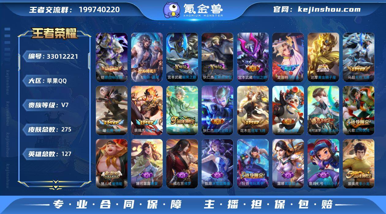 V7 1典藏 1珍品 12传说 2星元 275皮肤 127英雄 【1水晶】铠-银白咏叹调【1珍品传说】张飞-兔狲·蓬尾【12传说】马超-无双飞将,达摩-黄金狮子座,狄仁杰-超时空战士,宫本武藏-地狱之眼,花木兰-冠军飞将,梦奇-胖达荣荣,夏洛特-浮生妄,曜-云鹰飞将,桑启-鸣野蒿,裴擒虎-祥瑞亨通【2星元】狄仁杰-星际治安官,宫本武藏-幽冥之眼【69史诗】元歌-无心,鬼谷子-五谷丰年,赵云-未来纪元,狂铁-电玩高手,阿轲-节奏热浪,安琪拉-心灵骇客,白起-星夜王子,百里守约-特工魅影,百里玄策-原初追逐者,蔡文姬-舞动绿茵,曹操-幽灵船长,嫦娥-拒霜思,程咬金-功夫厨神,妲己-女仆咖啡,妲己-魅力维加斯,大乔-猫狗日记,狄仁杰-魔术师,狄仁杰-鹰眼统帅,貂蝉-圣诞恋歌,宫本武藏-鬼剑武藏,花木兰-水晶猎龙者,橘右京-修罗,黄忠-火炮绅士,铠-曙光守护者,兰陵王-暗隐猎兽者,李白-千年之狐,李元芳-逐浪之夏,廉颇-地狱岩魂,廉颇-寅虎·御盾,刘邦-德古拉伯爵,刘禅-绅士熊喵,刘禅-天才门将,露娜-紫霞仙子,鲁班七号-电玩小子,吕布-圣诞狂欢,吕布-末日机甲,墨子-金属风暴,娜可露露-晚萤,牛魔-奔雷神使,裴擒虎-李小龙,沈梦溪-月团寄思,孙膑-天狼运算者,孙策-猫狗日记,孙尚香-水果甜心,孙尚香-蔷薇恋人,王昭君-偶像歌手,夏侯...