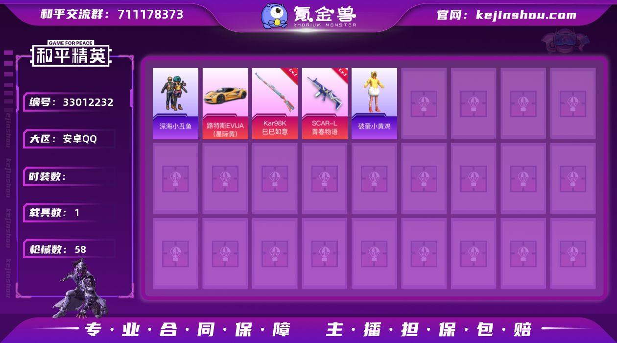 XS1143【关注店家每日捡漏价100个】4有二次【身法号1载具-2特效枪 深海小丑鱼】 安卓手Q-1载具-2特效枪-62套装-58枪皮-0王牌印记-坚韧铂金Ⅴ-19019热力值【1载具】路特斯EVIJA(星际黄)【2特效枪】SCAR-L-青春物语[5级],Kar98K-巳巳如意[2级]【3稀有】深海小丑鱼,M762-奇异狩猎者,M24-奇异狩猎者【2飞行器】空岛之星尾迹,炫彩糖果飞行器【1头盔】银河战甲头盔【115其它衣服和枪皮】霓虹街区,黄色运动,街舞之王,SS24特训,破蛋小黄鸡,SS37特训,幻影武者,SS31特训,魅力单车,SS28特训,都市魅力,吉莉礼服,探宝勇士,绮丽涂鸦,缤纷果语,长空猛禽,飞驰魅影,光之冒险,蓝色运动,黑色伏地魔,深蓝色名流,冰河战士,SS29特训,竞技名士,SS22特训,虎虎生威吉莉,海岛探路者,狙击之神,贵族骑装,虚音幻奏,白熊同盟,六六大吉,巳巳如意,炫蓝之夏,SS36特训,蝶变,音速流光,SS27特训,战术大师,王牌教练,猛禽,SS21特训,SS23特训,甜心亚梦,冷焰舞者,海盐绵绵冰,幻世战舞者,麻辣教官,灼焰舞者,龙的传人,龙魂突击队,竞技达人朋克,SS34特训,SS20特训,SS19特训,元素星魂,柠萌假日,SS25特训,绯格组合,SS26特训,空岛之星,QBZ-彩虹符号,MG3-幻世战舞者,Mini14-涂山之恋,AWM-天降萌叽,平底锅-空岛之星,M16A4-幻世...