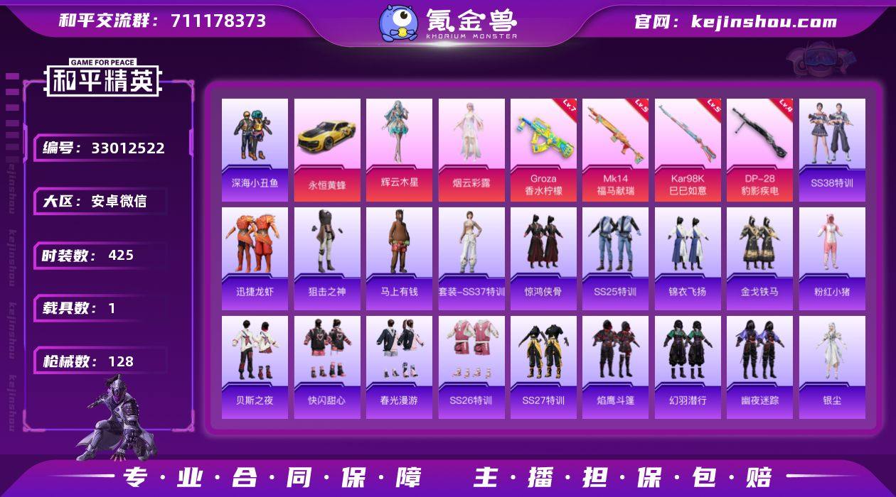 【有社交限制 不影响游戏正常使用 】时装数: 425 载具数: 1 枪械数: 128 战备数: 102 热门装扮: 深海小丑鱼,烟云彩露,辉云木星 载具: 永恒黄蜂 稀有枪皮: GROZA-香水柠檬(七级),Kar98K-巳巳如意(五级),Mk14-福马献瑞(五级),DP-28-豹影疾电(四级)