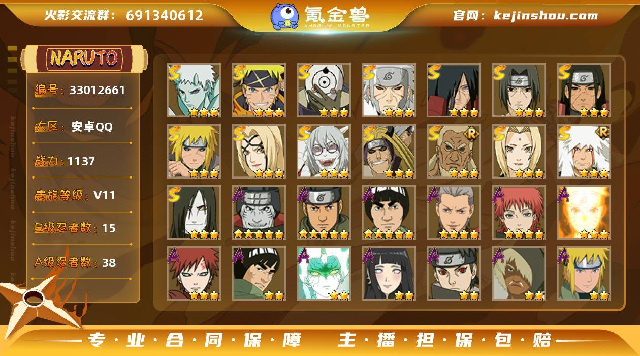 (免费转苹果)V11,战力1137W,15S级忍者数-38A级忍者数,死门凯66片,热门A忍,新春水门,暴怒带土等 ME2270 【S级忍者】:金角·银角「秽土转生」(3星),波风水门「秽土转生」(3星),千手扉间「秽土转生」(3星),千手柱间「秽土转生」(3星),宇智波斑「秽土转生」(3星),宇智波鼬「须佐能乎」(3星),艾「三代目雷影」(3星),自来也「舞之豪杰」(3星),大蛇丸(3星),纲手(3星),纲手「百豪」(3星),药师兜「仙人模式」(3星),宇智波斑 「白面具」(3星宇智波斑「白面具」),漩涡鸣人·宇智波佐助(3星),宇智波带土「十尾人柱力」(3星) 【A级忍者】:波风水门「青年」(2星),波风水门「新春限定」(2星),达鲁伊「博人传」(2星),迪达拉(2星),迪达拉「秽土转生」(2星),大蛇丸「晓」(2星),奇拉比(2星),奇拉比「忍界大战」(2星),飞段(4星),飞段「死司凭血」(2星),干柿鬼鲛(5星),漩涡鸣人「仙人模式」(2星),漩涡鸣人「九尾查克拉」(3星),迈特凯(5星),旗木卡卡西「万花筒写轮眼」(2星),我爱罗「疾风传」(3星),我爱罗「忍界大战」(2星),蝎(4星),小南(2星),角都(2星),角都「地怨虞」(2星),猿飞阿斯玛(5星),猿飞阿斯玛「秽土转生」(2星),宇智波止水(2星),宇智波鼬(...