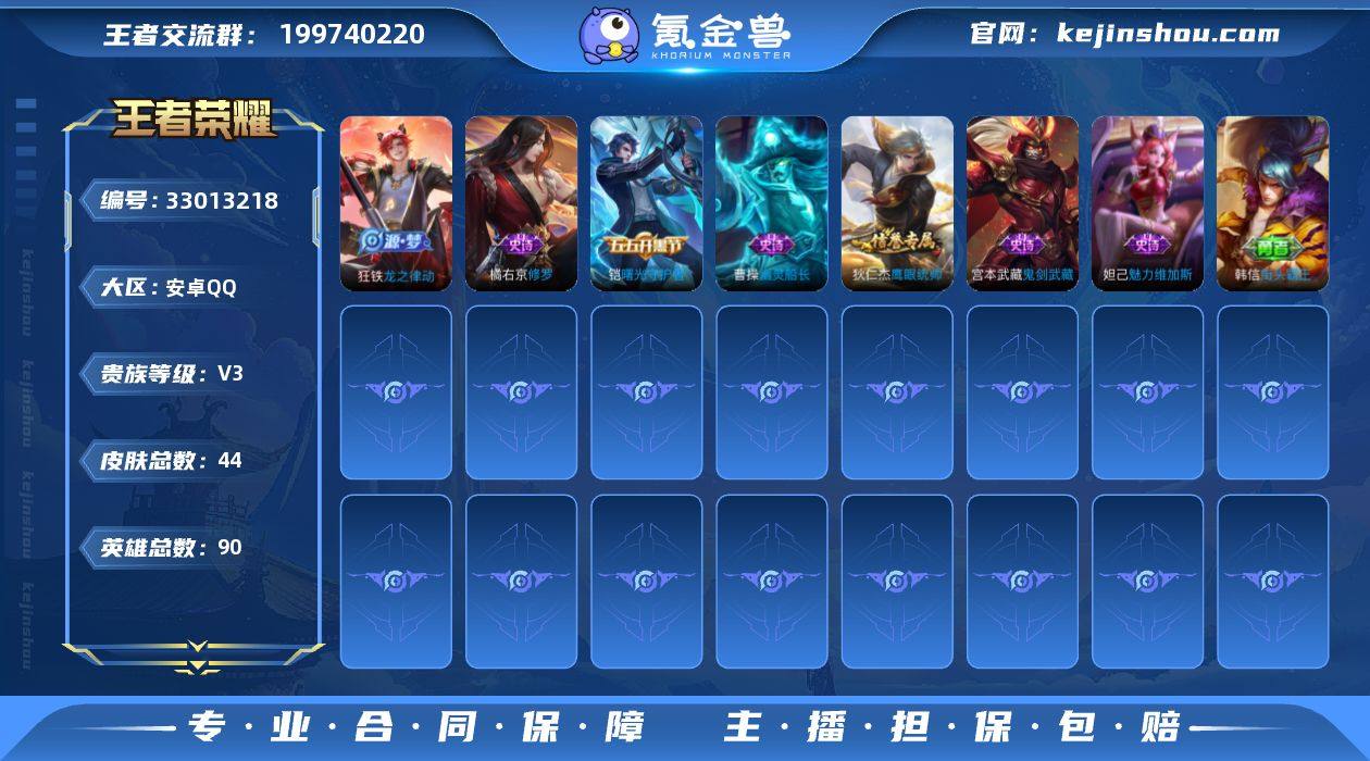 JJ4442:安卓Q-V3-鬼剑武藏 龙之律动 修罗 魅力维加斯-无二次-永恒钻石III-90英雄-44皮肤-0典藏-0无双-0珍品传说-0传说-8史诗 【稀有英雄】 不知火舞 橘右京 夏洛特 娜可露露 韩信 赵云 【史诗皮肤】 鬼剑武藏 龙之律动 修罗 魅力维加斯 鹰眼统帅 节奏热浪 曙光守护者 幽灵船长 【勇者皮肤】 纽约教父 拳王 阴阳师 牛运亨通 死亡骑士 危途狂花 忍·炎影 街头霸王 紫罗兰之誓 【其他皮肤】 龙域领主 生化警戒 木偶奇遇记 福禄兄弟 星航指挥官 启蛰 埃及法老 西部大镖客 孤猎 精灵公主 赤焰之缨 露花倒影