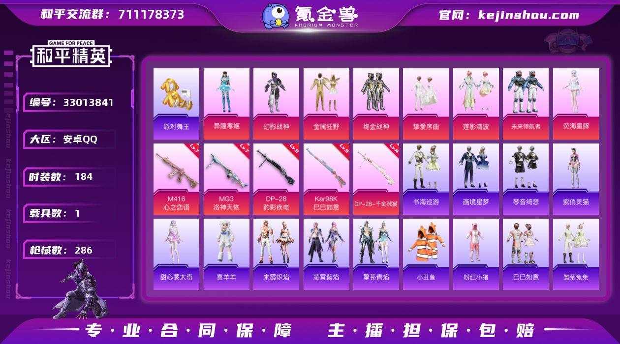 安卓 手Q-8粉装-8特效枪-1载具-4粉色飞行器-83727热力值-10王牌印记-184套装-286枪皮 【热门品类】:套装-派对舞王,套装-小丑鱼,套装-粉红小猪 【粉色套装】:粉装-幻影战神,粉装-金属狂野,粉装-绚金战神,粉装-挚爱序曲,粉装-莲影清波,粉装-未来领航者,角色-荧海星豚,角色-异瞳寒姬 【粉色枪皮等级】:AKM-暮色玫影(三级),M416-心之恋语(七级),Kar98K-巳巳如意(五级),Mk14-福马献瑞(五级),AA12-G-萌骑幻想(五级),DP-28-千金淑猫(四级),DP-28-豹影疾电(五级),MG3-洛神天依(七级) 【粉色载具】:暮色幽蹄 【粉色枪皮】:AKM-暮色玫影,M416-心之恋语,Kar98K-巳巳如意,Mk14-福马献瑞,AA12-G-萌骑幻想,DP-28-千金淑猫,DP-28-豹影疾电,MG3-洛神天依 【粉色飞行器】:炫彩糖果飞行器,凤舞九天飞行器,暮色之舞飞行器 【粉色降落伞】:洛神天依降落伞,恐龙拽拽降落伞,闪光银龙降落伞,音爆索尼克降落伞,未来歌姬降落伞,莲影清波降落伞,圣堂之誓降落伞,精灵梦叶罗丽降落伞,金丰海韵降落伞,拳皇·狂花道降落伞,千金淑猫降落伞,冷漠罗丽降落伞,无垠阁降落伞,喜羊羊与灰太狼降落伞,异瞳寒姬降落伞,炫彩糖果降落伞,暮色玫影降落伞 【稀有套装】:套...